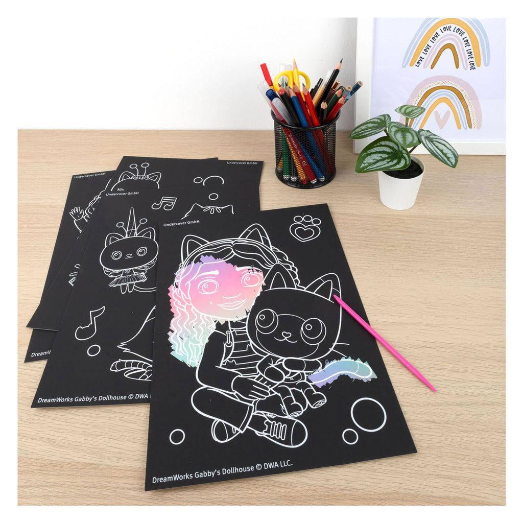 In deze set van Gabby's Dollhouse vind je vier zwarte kaarten. Maar welk Gabby's Dollhouse personage er onder de zwarte kraslaag zit, is een verrassing. Pak snel het bijgeleverde kraspennetje om erachter te komen! Met 4 scratch kaarten en krasstokje.