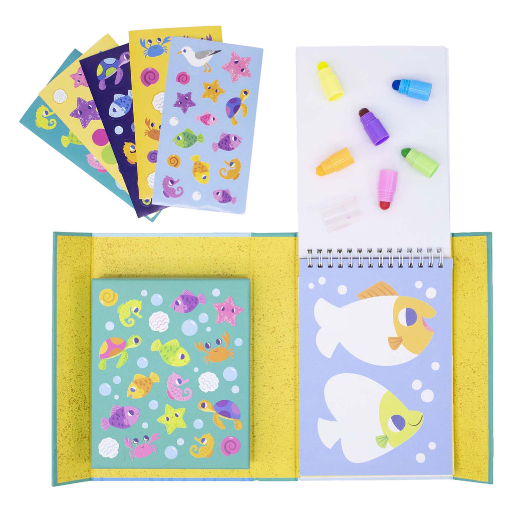 • Complete set: Bevat 8 waskrijtjes en een kleurboek boordevol strand- en zomerillustraties, allemaal handig verpakt voor creatieve uitspattingen thuis of onderweg.