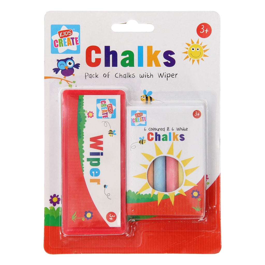 Set van 12 witte en 12 gekleurde schoolkrijtjes, inclusief wisser.