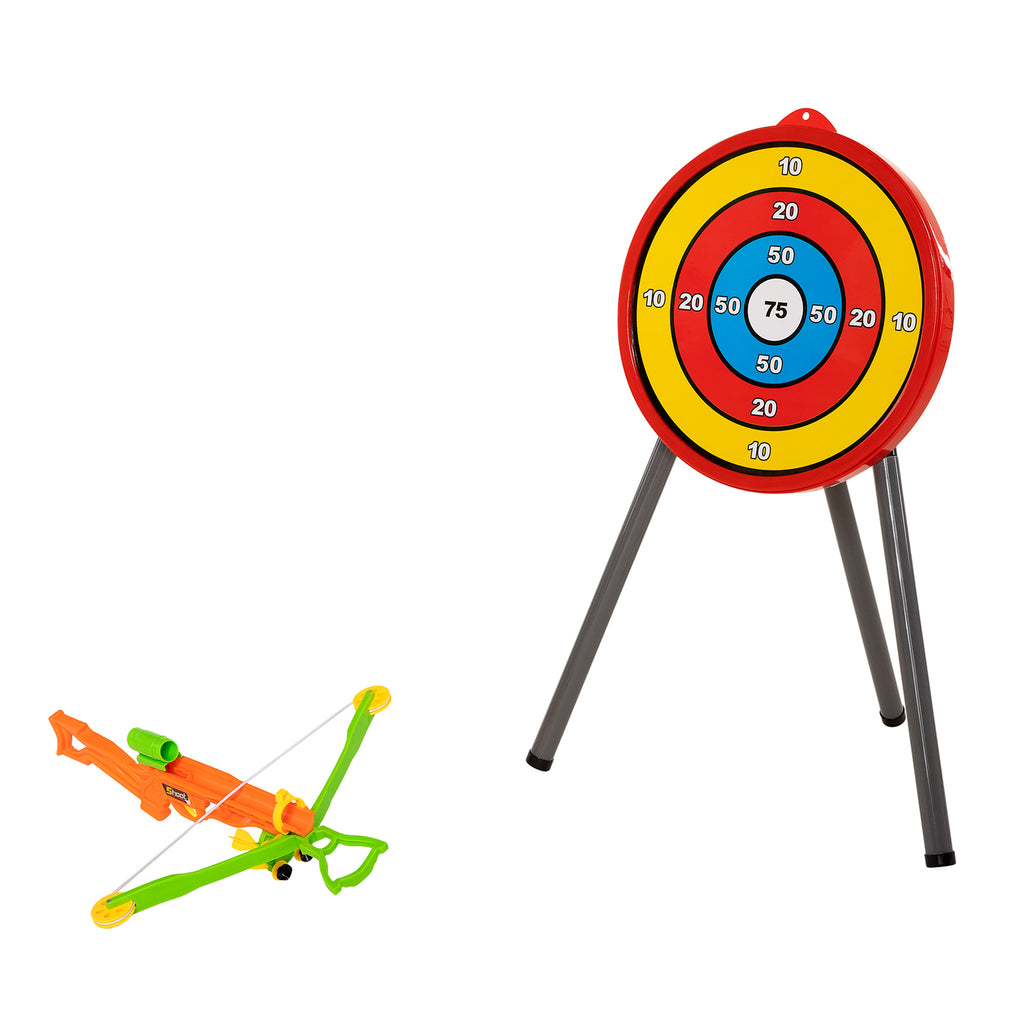 Deze gekleurde kruisboogset met doelwit is geschikt voor binnen en buiten. De kruisboog heeft een eenvoudig spanningsmechanisme. Zet het schietbord neer en neem een aantal stappen achteruit. Plaats de pijlen met zuignappen in de kruisboog en richt de pijlen. Ga jij voor het hoogste aantal punten? De set bevat een kruisboog, doelwit en vier pijlen. Geschikt vanaf 3 jaar.