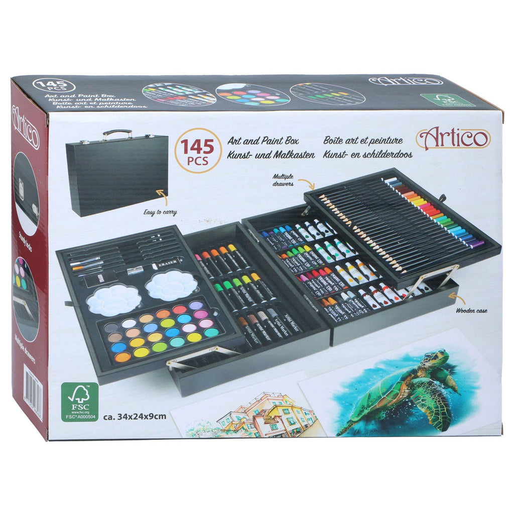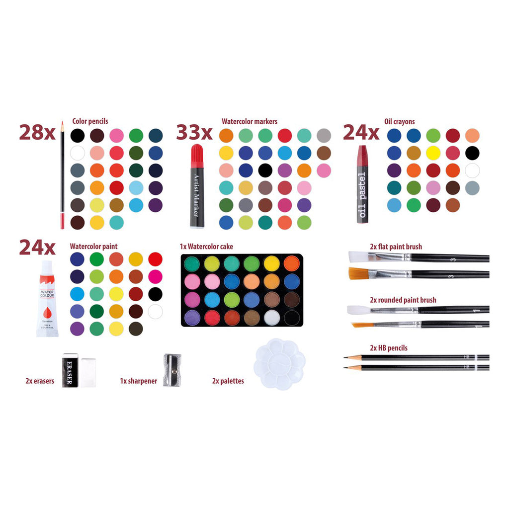 145-delig met 28 kleurpotloden, 33 viltstiften, 24 waskrijtjes, 24 waterverf, 1 waterverf palet, 2 gummen, 1 puntenslijper, 2 paletten, 2 platte verfkwasten, 2 ronde verfkwasten, 2 HB potloden. Geschikt voor kinderen vanaf 3 jaar.