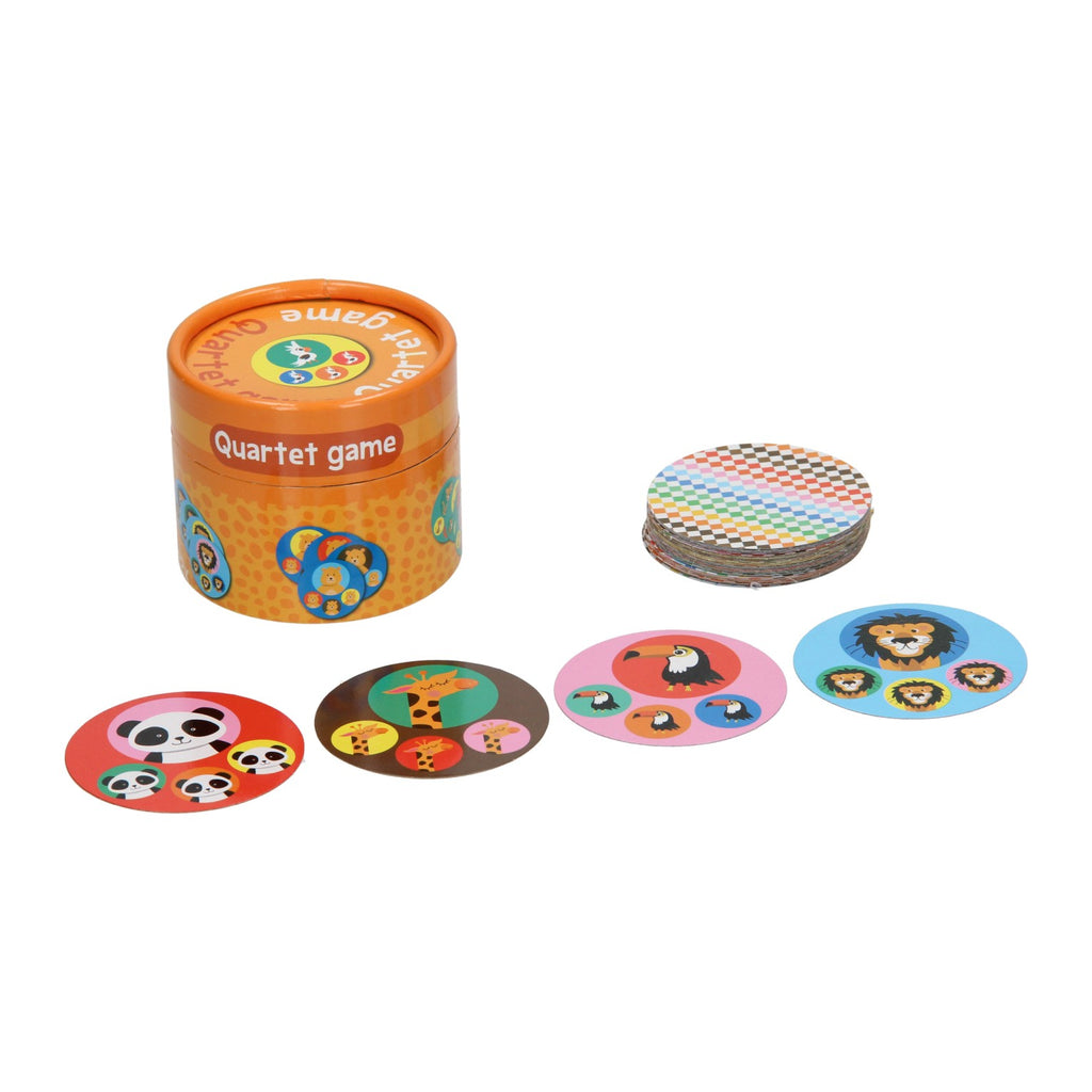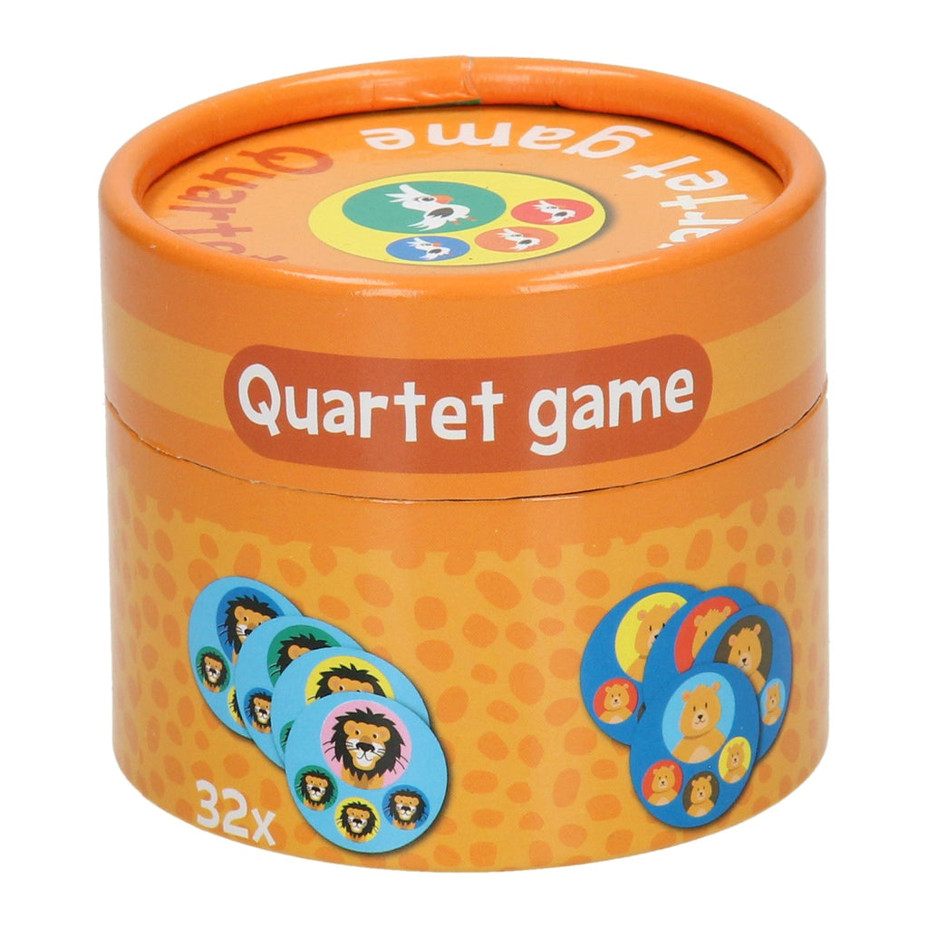 Kwartet dieren in een rond opbergdoosje. Inhoud: 32 kaarten. Geschikt voor kinderen vanaf 3 jaar.