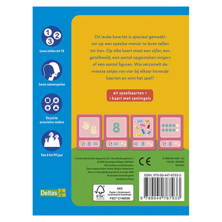 Leer je kind tellen tot tien met dit vrolijke kwartetspel! Op elke kaart staat een cijfer, een getalbeeld, een aantal opgestoken vingers of een aantal figuren. De bedoeling is dat je zoveel mogelijk setjes verzamelt van vier bij elkaar horende kaarten met hetzelfde aantal. Wie verzamelt de meeste kwartetten en wint het spel?