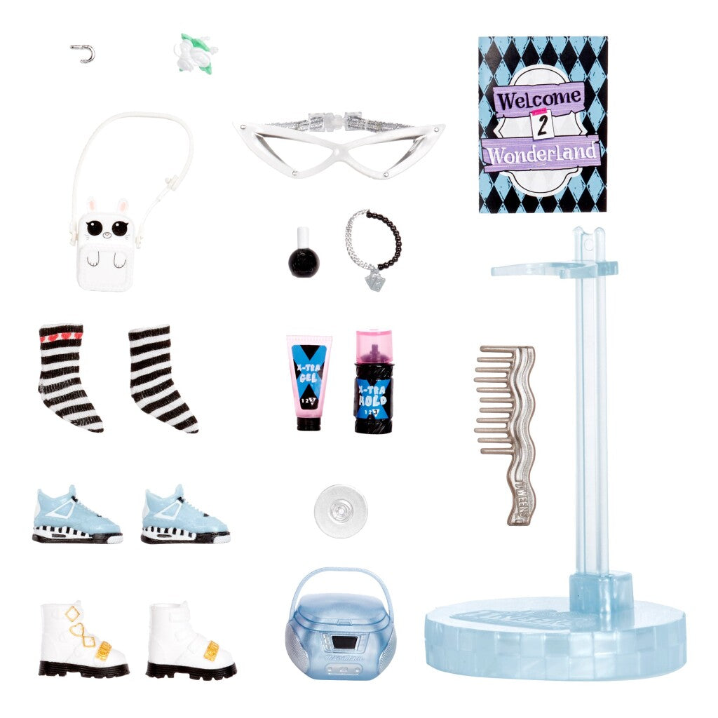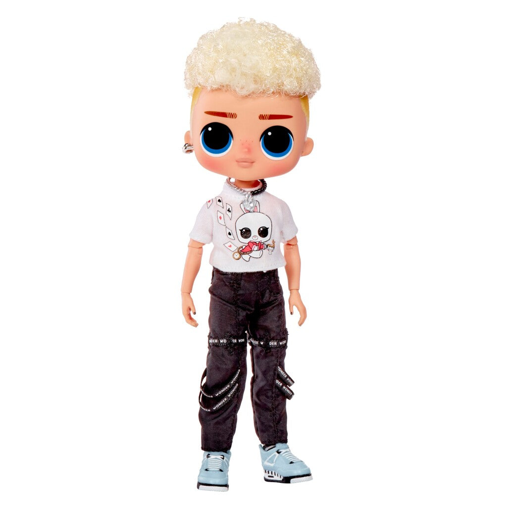 Je bent uitgenodigd voor de party van het jaar met L.O.L. Surprise Tweens Masquerade Max Wonder. Als eeuwige rebel droomt hij ervan om ooit een ster te worden met zijn boyband. Max bepaalt zijn eigen ritme en staat altijd klaar om soepel te switchen van partymode! Trek hem zijn partyblazer, kilt en dansschoenen aan en dan is hij klaar om in een gloednieuwe look te feesten! Pak 20 verrassingen uit, waaronder een Tweens-modepop met coole details, prachtig haar en zijn eigen punkpopstijl. Elke doos is inclusief een L.O.L. Surprise Tweens-modepop, een coole partyoutfit, een hoepeloorbel, 2 paar schoenen, een blazer, een kilt, een crossbodytas met konijnenthema, een maskerademasker, een draagbare cd-speler, haarspray, een bloemencorsage, halsketting van speelkaarten, een haarborstel en een poppenstandaard. De jongensmodepop is niet anatomisch correct. Geschikt voor kinderen vanaf 4 jaar.