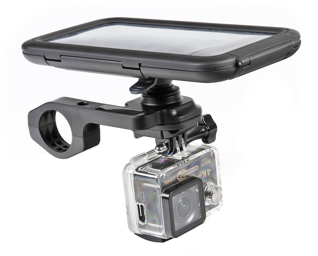 Staat het gebruik van een action cam en telefoonhoesje tegelijkertijd toe. 360 ° verstelbaar. Produktspecificaties: Universele bevestiging voor sturen van 22-31 mm. Kijkhoek instelbaar door kogelkoppeling 360 ° instelbaar, maakt het gebruik van de accessoires verticaal en horizontaal mogelijk. DUO LOCK connector voor montage van Opti-cases en accessoires