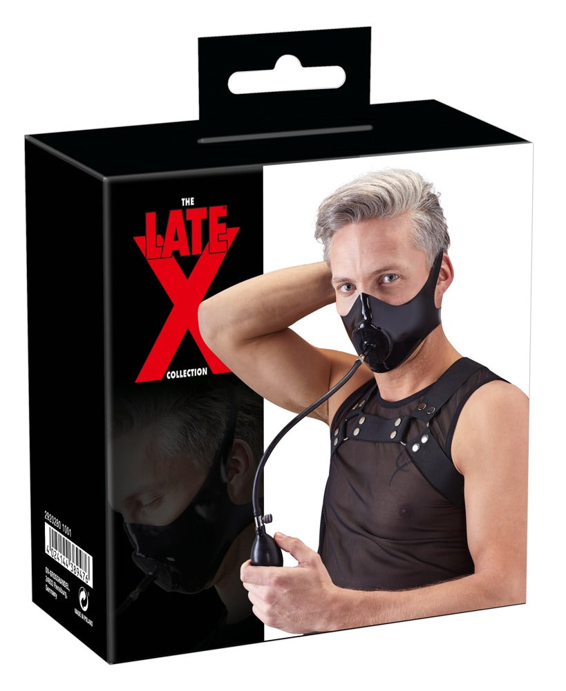 Pitch-black mask for mouth and nose with an inflatable, penis-shaped latex gag - with glans and veins. The gag's highlights are its special design and the perfect fit - it can be adjusted with the 2 head straps. The size of the gag can be varied with the pump ball that is connected to the front of the mask by a hose.