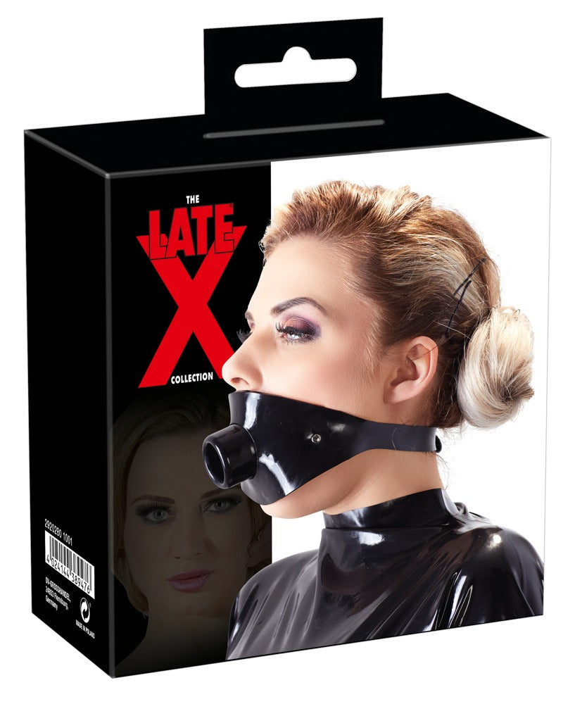 Pitch-black latex gag with a short, sturdy tube (piss gag). Makes sure that any kind of liquid can freely flow into the mouth - the victim can only accept it. The gag is perfectly processed and is adjustable in size with a strap that has a buckle fastener at the end. For fun without limits or refusal.