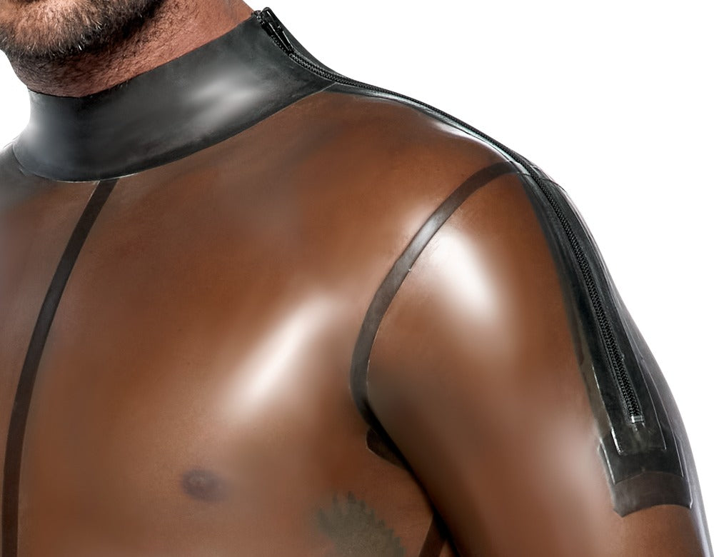 Opwindend transparante jumpsuit met lange mouwen van LateX, volledig gemaakt van rookkleurige latex. Past als een tweede huid. Met een rits op elke schouder tot aan de opstaande kraag voor gemakkelijk aan- en uitkleden. De praktische rits in het kruis loopt door tot over de billen.
