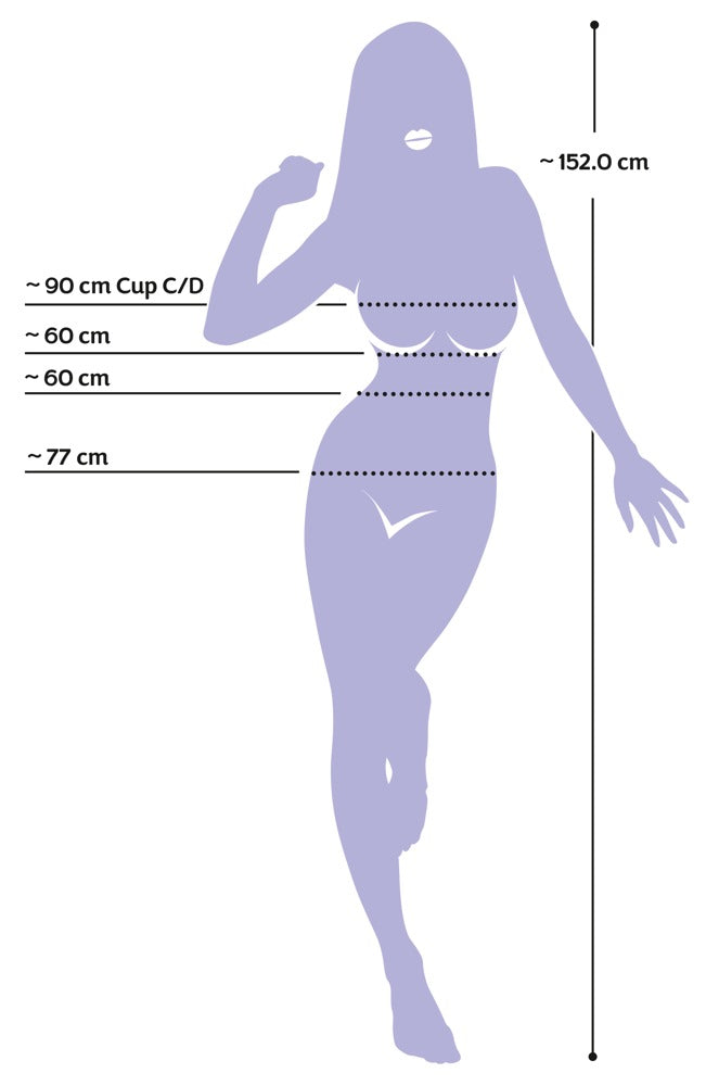 Afmetingen (omtrek): Borst 90 cm, taille 60 cm, heupen 77 cm.