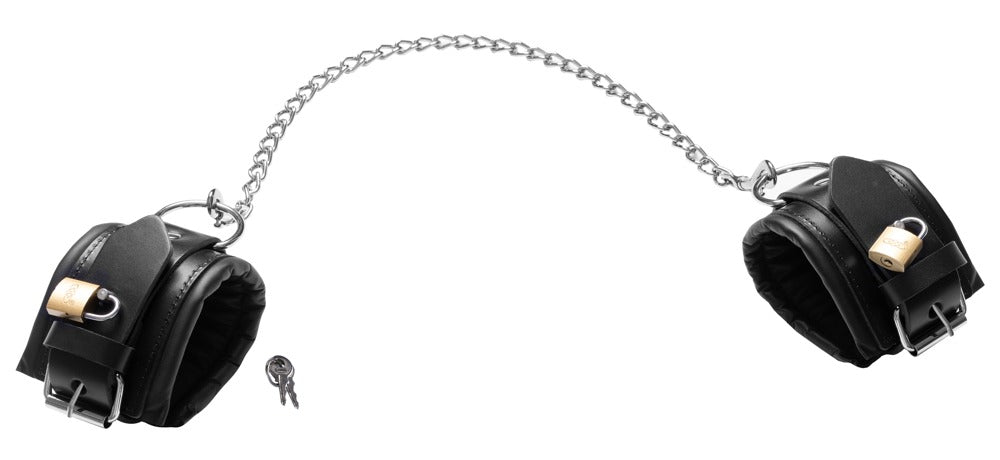 Hoogwaardige, robuuste enkelboeien van ZADO gemaakt van zwart leer met zilverkleurige accessoires. Verstelbaar met gespsluitingen. Zorgvuldig gemaakt en gestikt, zacht gevoerd aan de binnenkant met glad leer. Inclusief een kruislange karabijnketting om de enkelboeien te verbinden en 2 goudkleurige sloten met sleutels om de sluitingen te vergrendelen.