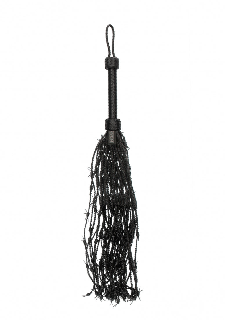 Deze prachtig vormgegeven, echte LEDEREN FLOGGER MET PRIKKELDRAAD zal uw onderdanige dankzij zijn intimiderende ontwerp angst inboezemen. De geïntegreerde lederen weerhaken zullen krassen en kriebelen bij licht gebruik. Bij zwaarder gebruik zijn ze echt een kracht om rekening mee te houden. De flogger is gemaakt van hoogwaardig echt leder en bestaat uit 36 fijngevlochten staarten, elk met versierde prikkeldraadknopen. Uitgerust met een uitstekend anti-slip handvat en polslus voor optimale controle. Deze flogger is een geweldige aanvulling voor elke BDSM-collectie! De totale lengte van deze zeer gewilde OUCH!-flogger is 77 cm (30.3") inclusief de 24 cm (9,5") voor het handvat. Het gewicht is een fikse 600 gram.