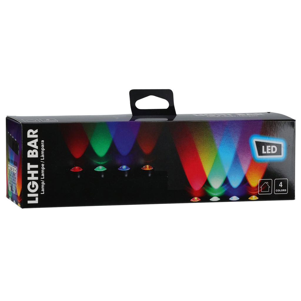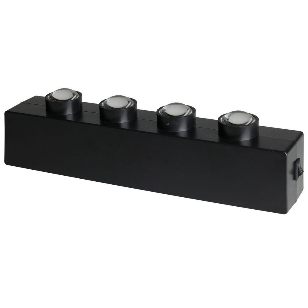 Zwarte, langwerpige kast met 4 gekleurde ledlampen. Werkt op batterijen (inbegrepen). Afmetingen: 25 x 4,5 x 7 centimeter.