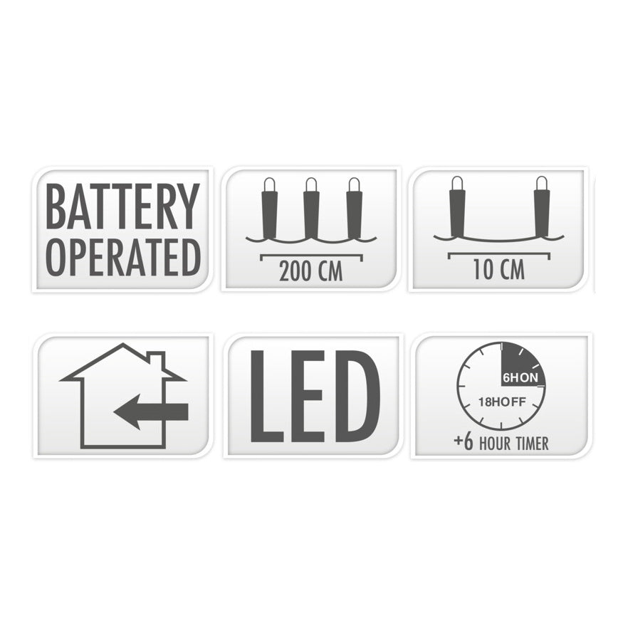 LEDlampjes lichtsnoer met 20 ledlampjes in multikleur met Timerfunctie. Werkt op batterijen. Voor binnengebruik.