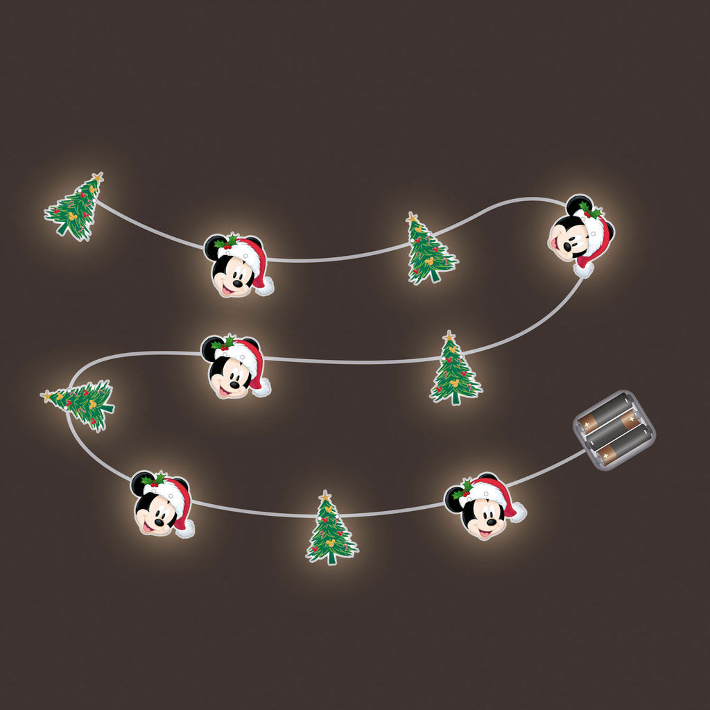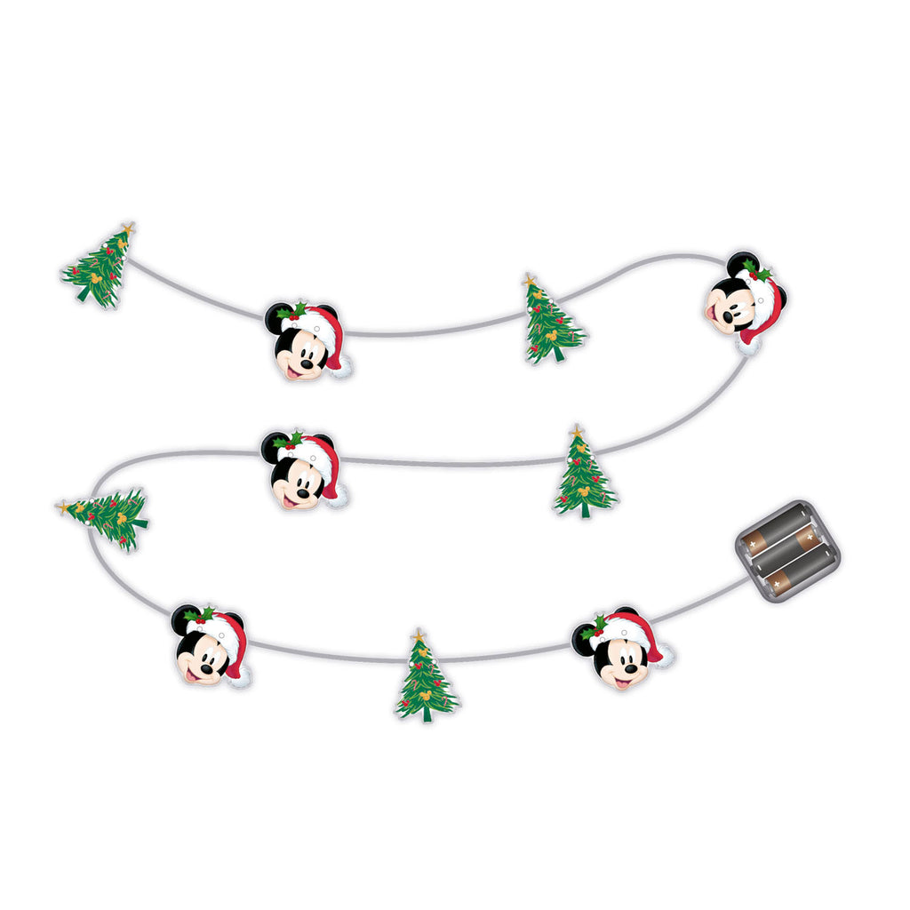 Lampjessnoer met afgewisseld Mickey Mouse en een kerstboomlampjes. De lampjes werken op 3 AA-batterijen (niet inbegrepen). Het snoer is 165 cm lang.