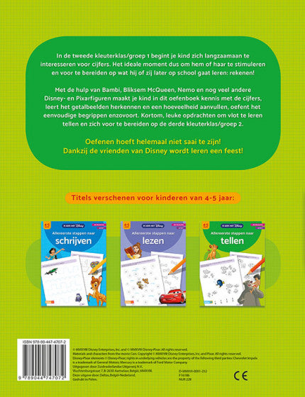 Met de hulp van Bambi, Bliksem McQueen, Nemo en nog veel meer andere Disneyfiguren maakt jouw kind in dit oefenboek kennis met cijfers. Het boekjes staat vol met leuke opdrachten om te leren tellen en je voor te bereiden op rekenen.
