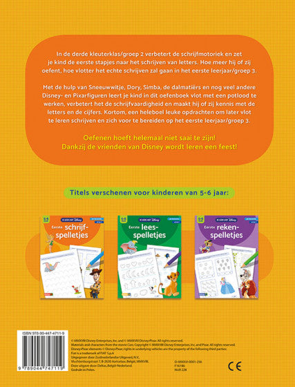 Met de hulp van Sneeuwwitje, Dory, Simba, de Dalmatiërs en nog veel meer andere Disneyfiguren leert je kind in dit oefenboek met een potlood te werken, verbetert het de schrijfvaardigheid en maakt hij of zij kennis met letters en cijfers. Kortom, een heleboel leuke opdrachten om te leren schrijven en je voor te bereiden.