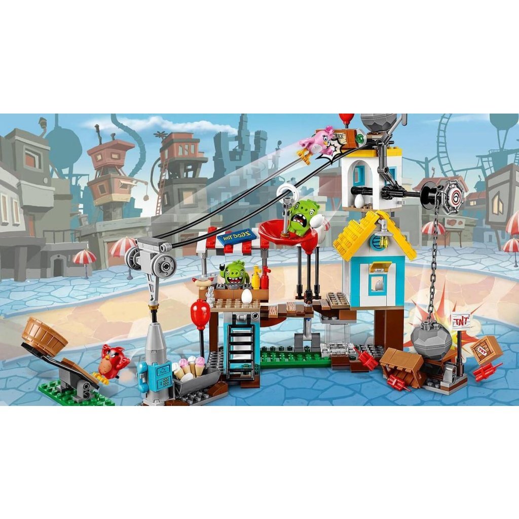 De varkens zijn overal in Pig City gestolen eieren aan het verstoppen. Lanceer de vogels met de katapult! Laat de gebouwen omvallen door de 4 doelwitten precies te raken. Deze grappige, chaotische set is gebaseerd op de Angry BirdsTM film en bevat een huisje, een brug, een hotdog-kraam, een varken aan een tokkelbaan en een TNT kettingreactie-functie! Inclusief 4 figuren. 386-delig. Geschikt voor kinderen vanaf 7 jaar.