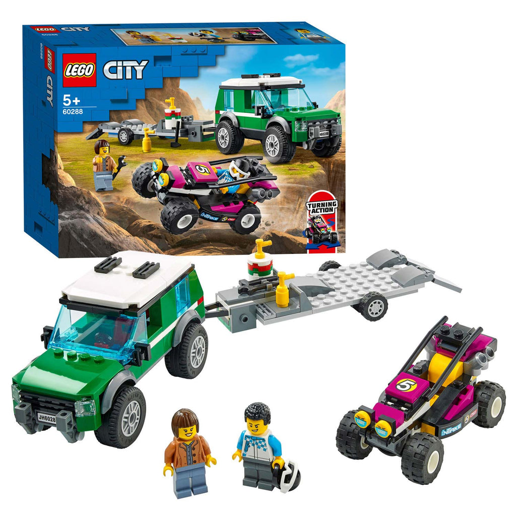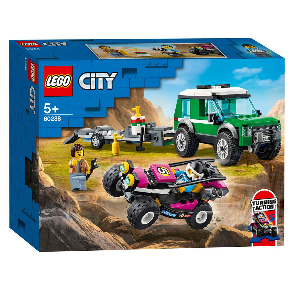 De dag van de race is aangebroken! Stap in de terreinwagen en ga naar het circuit. Klap de aanhangwagen omlaag en laad de supercoole Baja buggy uit. Zet je helm op, til de veiligheidskooi omhoog en stap in. Klaar voor de start? AF! Schiet ervandoor, stuur in de bochten, scheur over de rechte stukken en dender over de finish voor een nieuw Lego City snelheidsrecord! Bouw een terreinwagen met aanhanger, die omlaag kan worden gebracht voor het vervoeren van de stuurbare Baja racebuggy.