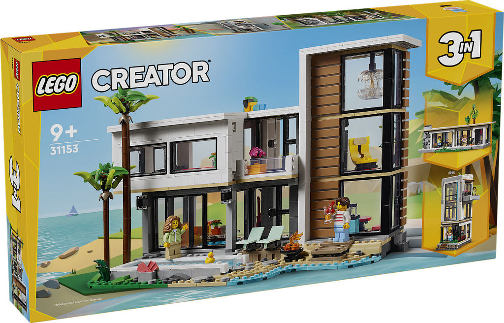 Jongens en meisjes kunnen 3 verschillende LEGO huizen ontdekken met deze leuke Modern huis (31153) set. Het luxe strandhuis met 2 verdiepingen ligt in de schaduw van 2 palmbomen en heeft een keuken, woonkamer, leeskamer, slaapkamer, doucheruimte, balkon en moderne meubels, waaronder een leunstoel en kroonluchter. Er is ook een zwembad voor leuke verhalen. Deze LEGO bouwset biedt een wereld vol mogelijkheden met 3 verschillende huizen om te bouwen met dezelfde set stenen. Kinderen kunnen een modern huis bouwen, dit vervolgens ombouwen tot een stijlvol stadsgebouw met 3 verdiepingen en een bubbelbad en dakterras of er een boshut van maken. Het moderne huis en het stadsgebouw van 3 verdiepingen bieden toegang tot de kamers vanaf de achterkant, terwijl de boshut een dak heeft dat kan worden geopend. Inclusief 2 minifiguren met verwisselbare outfits. Elk van de 3 modellen kan worden gemaakt met behulp van de LEGO Builder app voor een leuke digitale ervaring. 939-delig. Geschikt vanaf 9 jaar.