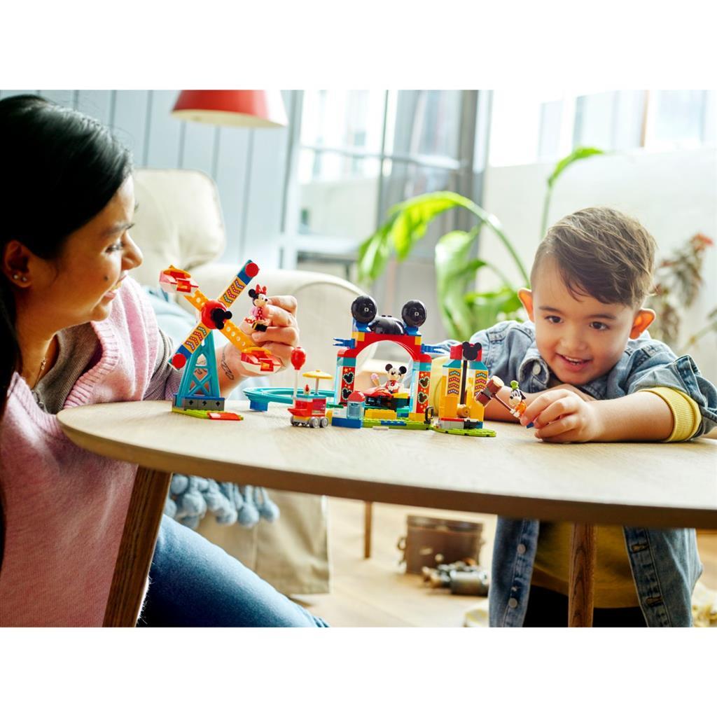 Er staan kinderen vanaf 4 jaar een hoop avonturen te wachten met dezeLego Disney 10778 Mickey Mouse Kermisplezier set met 3 attracties, 2 kleine modellen, verschillende accessoires en 3 minifiguren. Kinderen ontwikkelen hun creativiteit en fantasie tijdens het bouwen en verkennen van de kermis. Deze set zit vol inspirerende details. Elk zakje bevat de stenen voor een compleet model dat kinderen kunnen bouwen om snel te gaan spelen! Inclusief een startsteen en grotere onderdelen om het bouwen een vliegende start te geven. Leuk voor het hele gezin. Aan de slag gaan is makkelijk: naast instructies met afbeeldingen heeft deze set ook interactieve digitale bouwinstructies in de gratis bouwinstructies app. Met de functies in deze app krijgen kinderen meer inzicht in het bouwproces en kunnen ze hun voortgang opslaan, zodat ze later verder kunnen bouwen.