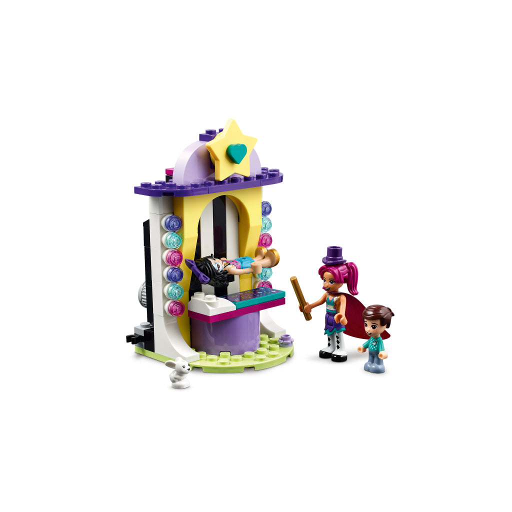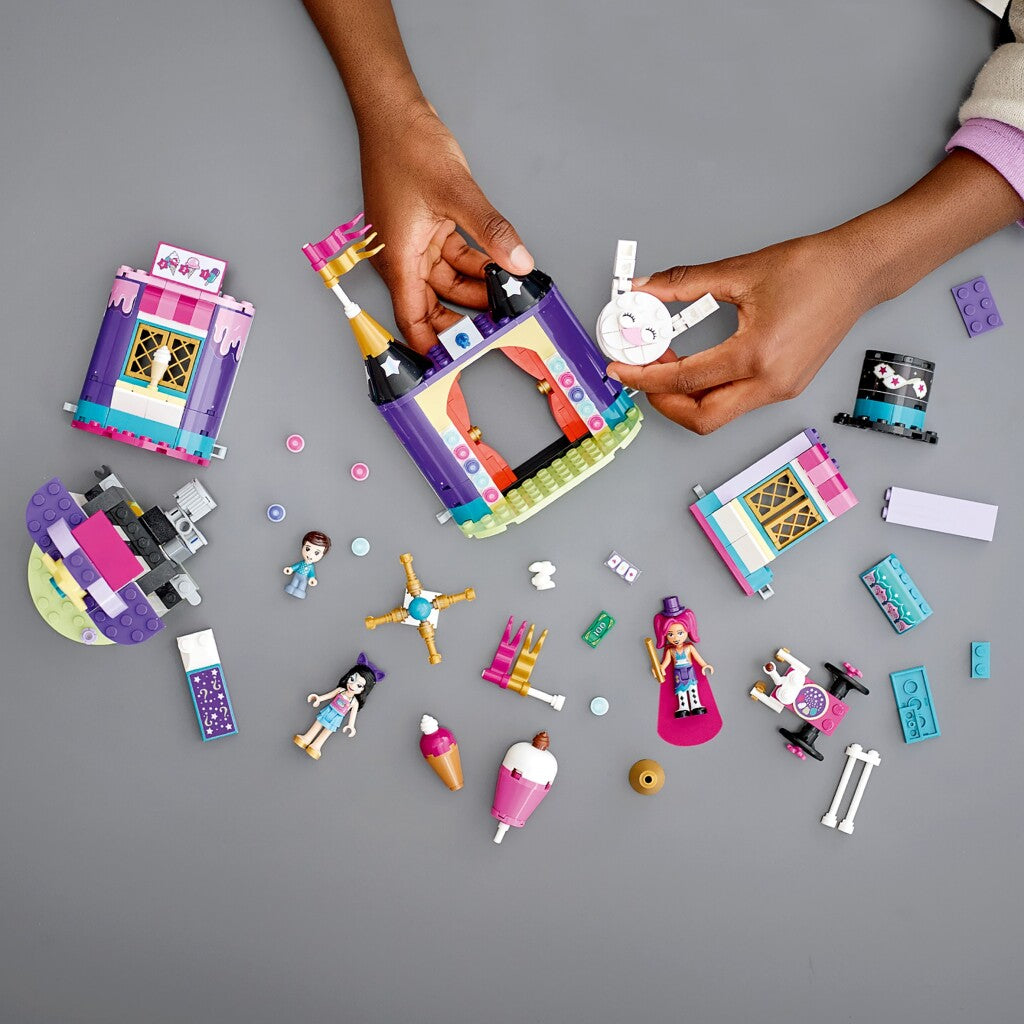 Haal het plezier van een echte kermis in huis met de LEGO Friends Magische kermiskraampjes (41687). Deze set bevat 4 kermiskraampjes met een afneembare goocheltruc, waarmee kinderen hun familie en vrienden kunnen vermaken. Met 2 LEGO Friends minipoppetjes en een micropoppetje zijn er een heleboel mogelijkheden voor creatieve rollenspellen. De speciale glow-in-the-dark stenen komen tot leven wanneer het licht uit gaat voor nog meer mysterieus plezier! Deze 361-delige set zit vol creatieve accessoires. Kinderen kunnen ijsjes verkopen, gezichten schminken of een kaartje voor de kermis kopen. Ze kunnen de goocheltruc ook meenemen als ze bij iemand gaan spelen om indruk op hun vrienden te maken met hun magie! Geschikt voor kinderen vanaf 6 jaar.