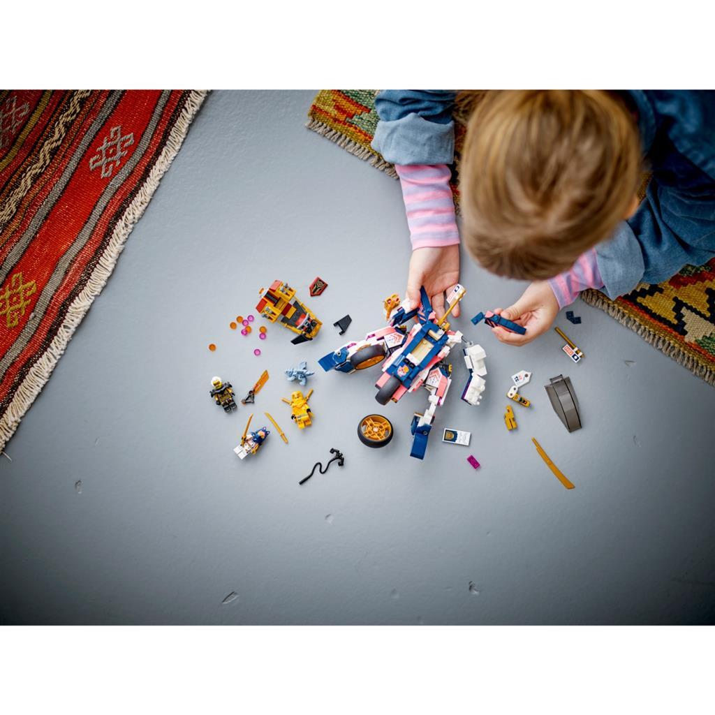 Prachtige speelset waarmee kinderen een verstelbare ninjamecha in een motor kunnen veranderen en race-actie uit de tv-serie NINJAGO Dragons Rising kunnen naspelen.