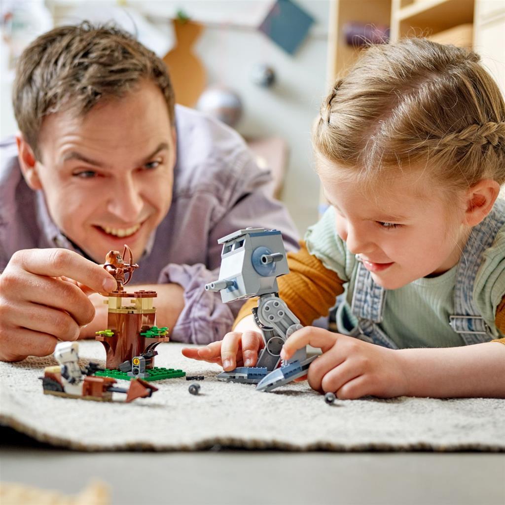 Jonge kinderen leren bouwen in het spannende LEGO Star Wars universum met deze AT-ST (75332) startset. Dit ideale cadeau voor kinderen vanaf 4 jaar bevat een eenvoudig te bouwen 4+ versie van de AT-ST walker uit Star Wars: Return of the Jedi met een cockpit voor een minifiguur. Inclusief LEGO minifiguren van Wicket, een Scout Trooper en een AT-ST bestuurder met wapens, plus een speeder en Ewok uitkijkpost met een boom en katapult om de Slag om Endor na te spelen.Bouwen met behulp van een appIn de gratis LEGO Bouwinstructies app vind je digitale bouwinstructies met zoom-, draai- en weergavefuncties die kinderen een nog leukere creatieve ervaring geven.De 4+ ervaringMet LEGO Star Wars 4+ bouwspeelgoed maken kinderen vanaf 4 jaar op een leuke manier kennis met het bouwen met LEGO stenen en de Star Wars saga. Dankzij de startstenen kunnen ze helemaal zelf ??? of met wat hulp van een broer, zus of ouder ??? voertuigen, gebouwen en nog veel meer bouwen en snel gaan spelen.
