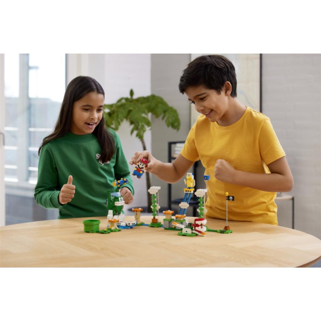 Met deze uitbreidingsset met herkenbare Super Mario uitdagingen en personages kunnen kinderen een spannend level tussen de wolken toevoegen aan hun LEGO Super Mario wereld.