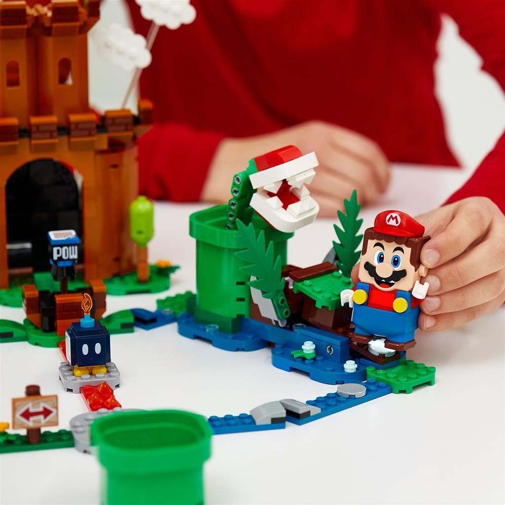 Voeg het spannende avontuur in de bewaakte vesting toe aan jouw Super Mario startset! Ren over het gras en spring op de katapult om de Koopa Troopa te verslaan en spring daarna op het platform om de vlag te hijsen. Of spring over lava en versla de Bob-omb. Neem de route over water en ga de strijd aan met de Piranha Plant. Alle 3 de wegen leiden naar het POW-blok, waarmee de poort van de vesting wordt geopend en jij munten verdient!