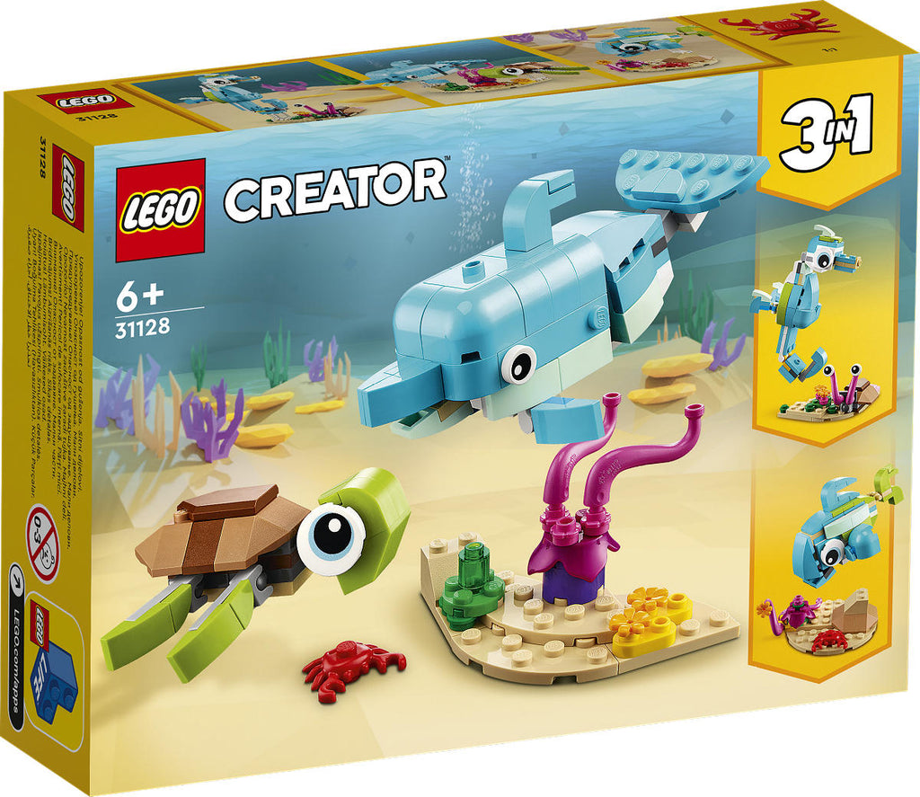 Met dezeLego Creator 31128 3in1 Dolfijn en Schildpad set kunnen fans naar de bodem van de zee duiken en genieten van eindeloze avonturen. De set bevat een babydolfijn met beweegbaar lichaam, flippers, bek en staart en een babyzeeschildpad met beweegbare flippersen kop, op een standaard. Het onderwaterplezier houdt nooit op met de 3 zeedieren die kinderen met deze set kunnen bouwen. Ze kunnen een beweegbare dolfijn en schildpad bouwen en deze later ombouwen tot een beweegbaar zeepaardje met een zeeslak, een mooie vis met een krab of zelf een compleet nieuw dier verzinnen. Geschikt voor kinderen vanaf 6 jaar.