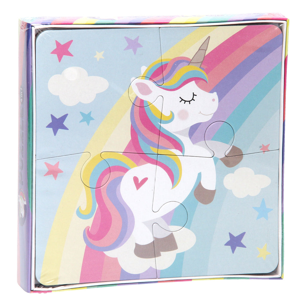 4 in 1 legpuzzel, 2 van een eenhoorn en 2 van een zeemeermin. Moeilijkheidsgraad van 4 stukken tot 12 puzzelstukken. Geschikt van 3 tot 6 jaar.