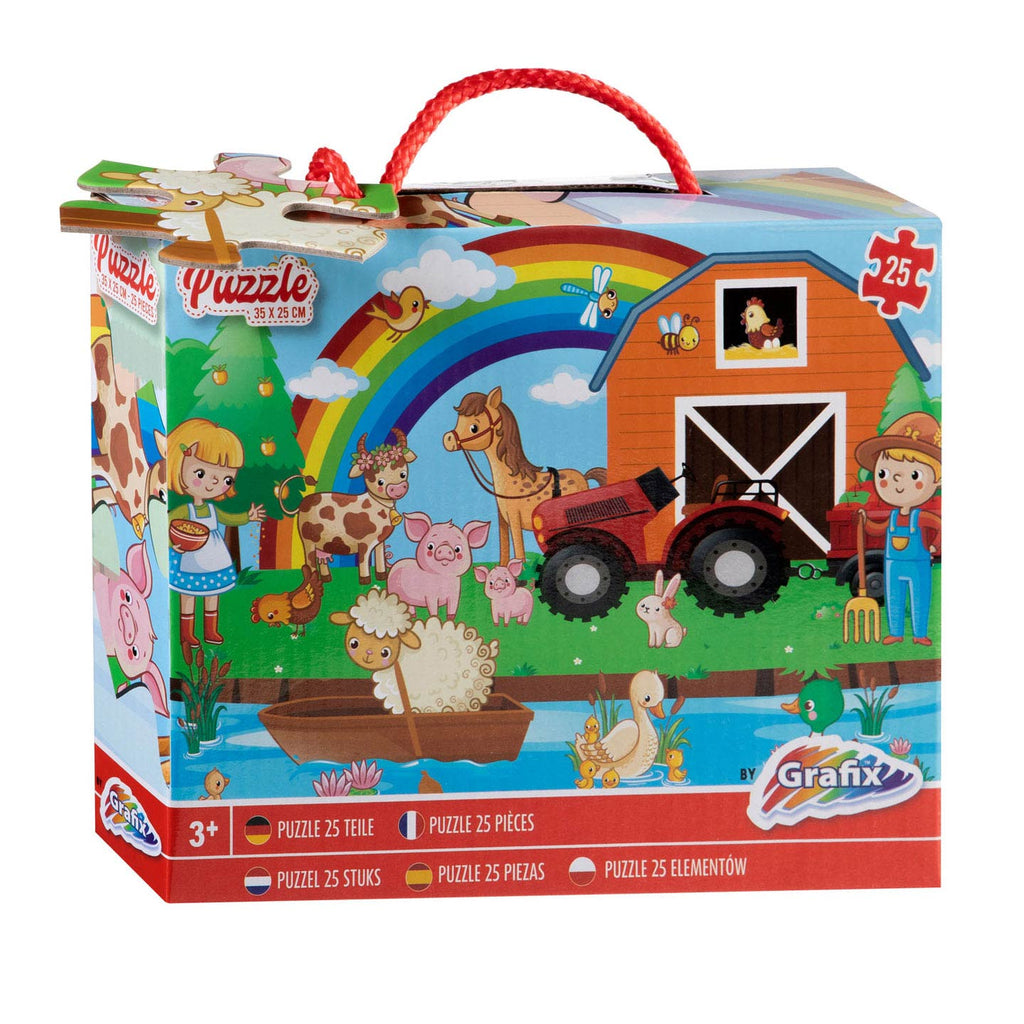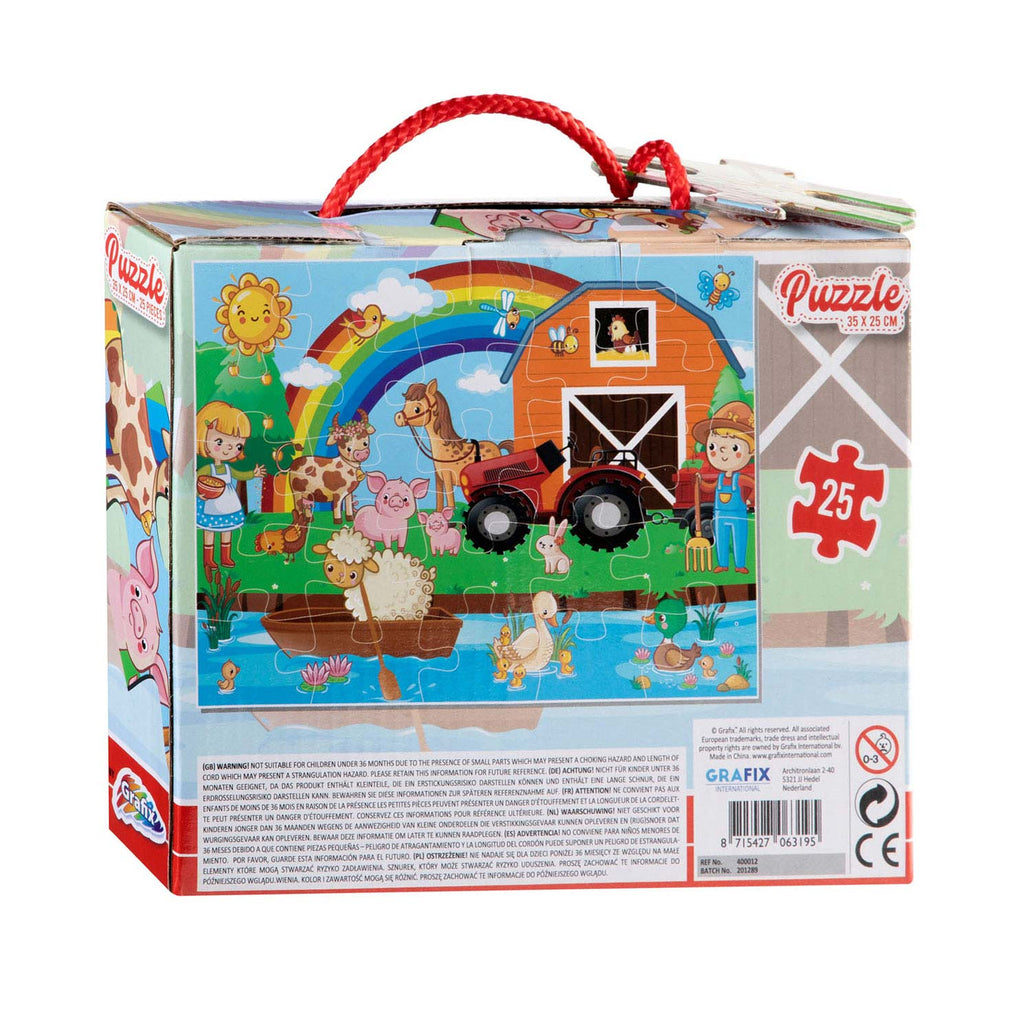 Legpuzzel met afbeelding van boerderij en boerderijdieren. Afmeting puzzel: 35 bij 25 cm. Geschikt van 3 tot 6 jaar.