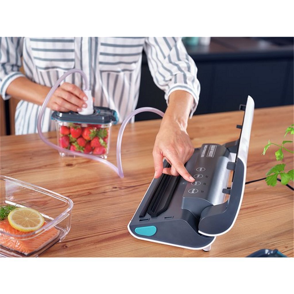 Omdat het bijna al het voedsel vacuüm- en afdicht en ervoor zorgt dat het tot vijf keer langer vers blijft - voor een langere houdbaarheid zonder conserveringsmiddelen.De efficiënte vacuümpomp heeft een capaciteit van negen liter per minuut.Het is praktisch dat de sterkte van het vacuüm individueel kan worden geregeld, omdat het vacuümapparaat van Leifheit is uitgerust met de pulsfunctie.Dit betekent dat zelfs drukgevoelige voedingsmiddelen zoals frambozen probleemloos kunnen worden verpakt.Devacuümmachine is intuïtief te bedienen via het akoestische sensor-touchscreen.Het vacuümproces kan ook worden onderbroken met de stopknop.Verder heeft Vacu Power 300 een aparte afdichtfunctie en elektronische temperatuurbewaking.Dit laatste zorgt voor een veilig gebruik van het apparaat.Naast zakken en rollen kan de Vacu Power 300 ook containers vacuüm trekken.De benodigde slang- en voedselbewaarbakken zijn apart verkrijgbaar.Bij de levering inbegrepen zijn tien gratis vacuümzakken van 20 x 30 cm.In principe kunnen alle gangbare rollen tot een maximale breedte van 30 cm worden gebruikt.