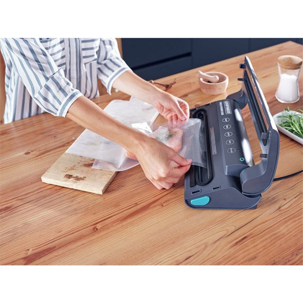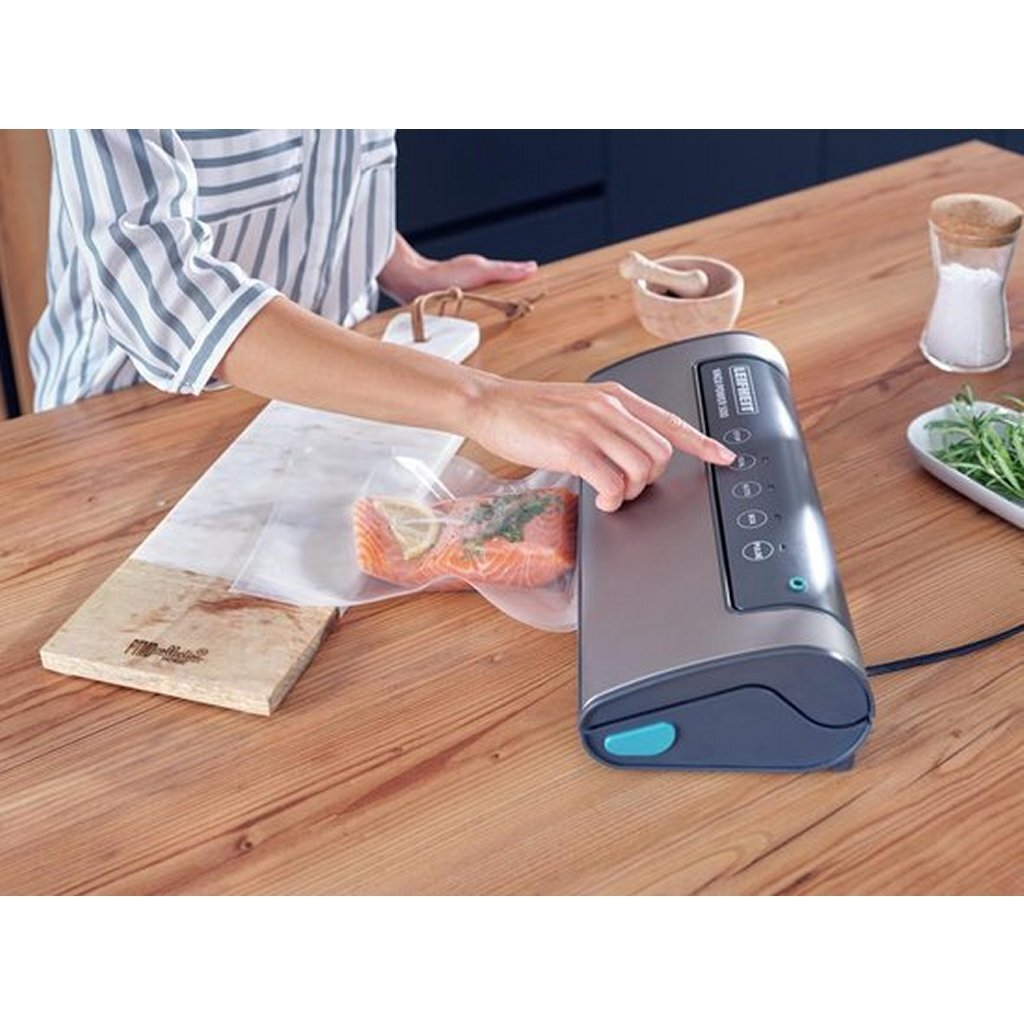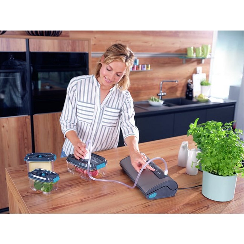 Vlees, fruit of groenten blijven vers en langer onder vacuüm - zoveel is zeker. Met zijn bijzonder effectieve vacuümpomp, die een capaciteit heeft van twaalf liter per minuut.DankzijdeVacu Power 500 blijft het eten tot wel vijf keer langer vers.Het akoestische sensoraanraakscherm zorgt voor intuïtieve bediening: het vacuümproces kan bijvoorbeeld gemakkelijk worden onderbroken met de stopknop.Daarnaast heeft deVacu Power 500 een aparte sealfunctie en kan hij een dubbele sealnaad creëren - voor bijzondere stabiliteit.De pulsfunctie is ook praktisch, waardoor de sterkte van het vacuüm individueel kan worden aangepast.Elektronische temperatuurbewaking zorgt voor veilig gebruik.Uiteraard kan het apparaat niet alleen conventionele vacuümzakken en rollen tot een maximale breedte van 30 cm stofzuigen, maar ook containers.Hiervoor zijn een apart verkrijgbare slang en voedselbewaarbakken nodig.Bij deVacu Power 500 van Leifheit worden tien gratis zakken geleverd met de afmetingen 20 x 30 cm.Uiteraard is de vacuümkamer afneembaar en makkelijk schoon te maken.