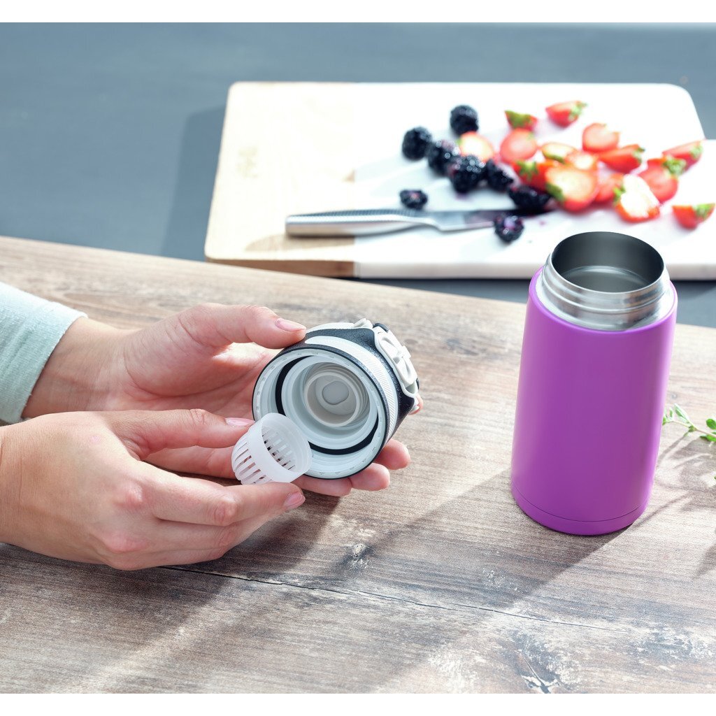 Als je op zoek bent naar een lekvrije thermobeker die je veilig in je zak kunt meenemen, dan is de Flip isoleerbeker van Leifheit de juiste keuze.Omdat deze verschillende veiligheidsfuncties heeft die voorkomen dat de inhoud lekt: het deksel is voorzien van een sluiting die 100% lekvrij is.Het slot voorkomt dat het deksel van de isolerende beker vanzelf opengaat.Hij kan dus gemakkelijk overal mee naartoe worden genomen.De drukknop is ook bijzonder praktisch voor onderweg.Hierdoor is het mogelijk om de beker met één hand te openen - en zonder hem neer te hoeven leggen.Het filterelement in het deksel voorkomt dat kruiden, fruit en dergelijke het drinken verstoren.Het filter kan van het deksel worden losgeschroefd en gemakkelijk grondig worden gereinigd.Uiteraard is de beker niet alleen geschikt voor koffie-to-go en andere warme dranken, maar ook voor coole dingen.Dankzij de dubbelwandige isolatie van roestvrij staal houdt het koude dranken tot 18 uur aangenaam koel en warme dranken tot6 uur warm.