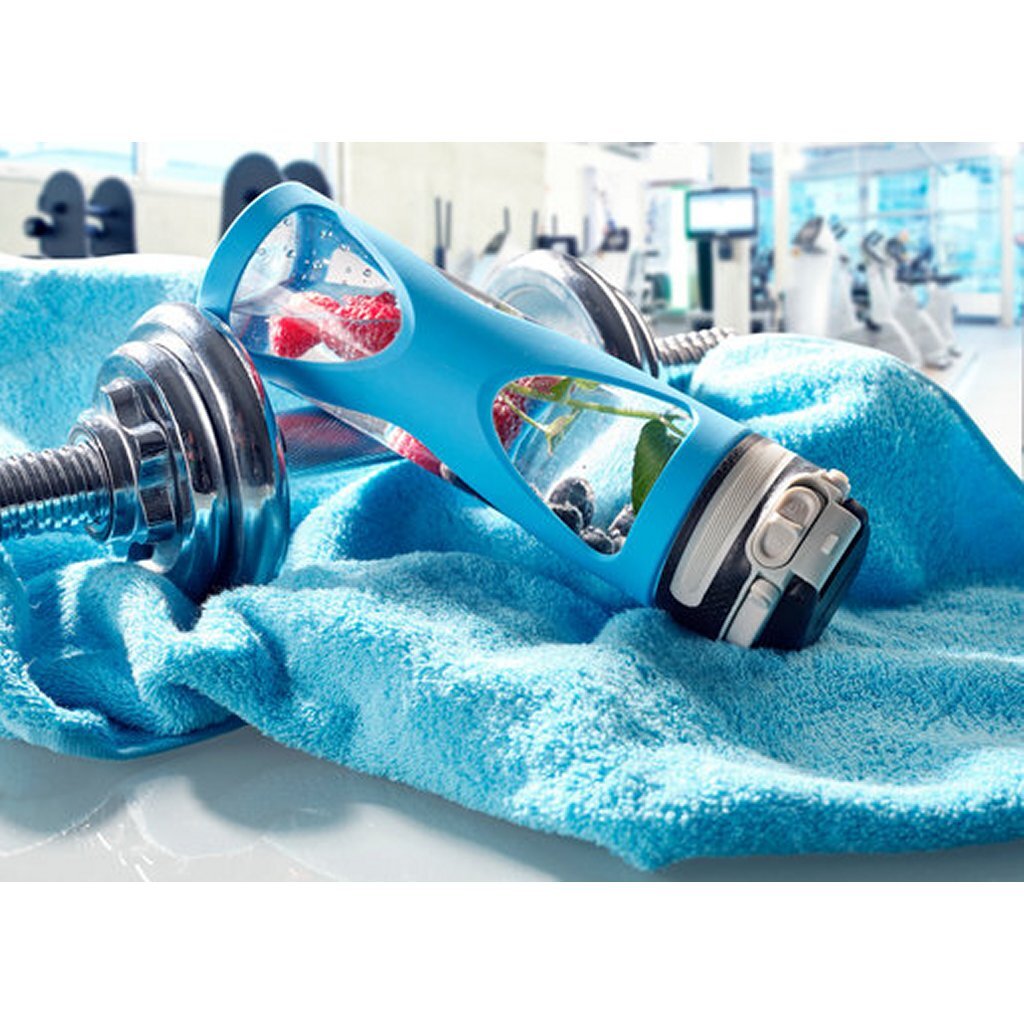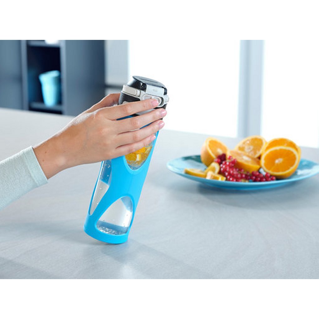 Drink overal comfortabel - zelfs als slechts één hand vrij is. Niet alleen gemakkelijk te gebruiken, maar ook 100% lekvrij.Doordat het deksel met schroefdop goed sluitkan deze niet per ongeluk worden geopend.Hierdoor kan de drinkfles veilig in je zak worden meegenomen.Bijzonder praktisch is ook de uitklapbare handgreep, die comfortabel dragen mogelijk maakt.De drinkfles is ook ideaal voor kinderen of om te sporten.Dankzij het handvat kan hij ook aan rugzakken of boekentassen worden bevestigd.Omdat de fles vrij is van BPA en andere schadelijke stoffen en bestaat uit hittebestendig glas, kan hij gevuld worden met koude en warme dranken tot 65 °C.Dankzij het schroefbare filter in het deksel kunnen fruit of kruiden worden toegevoegd zonder het drinken te storen.De siliconencoating van de fles beschermt tegen hitte en glasbreuk.Hierdoor is hij ook gemakkelijk vast te houden.Er is ook een softgrip-oppervlak op het deksel om het openen van de fles gemakkelijker te maken.