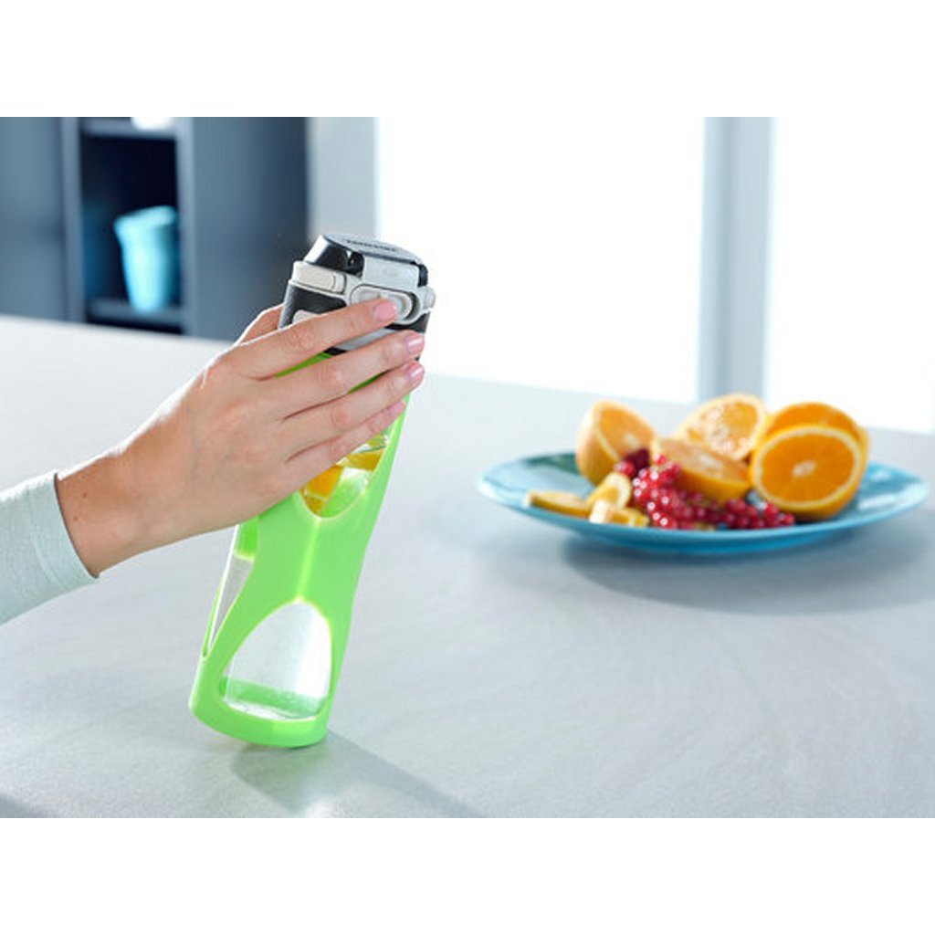 Drink overal comfortabel - zelfs als slechts één hand vrij is. Niet alleen gemakkelijk te gebruiken, maar ook 100% lekvrij.Doordat het deksel met schroefdop goed sluitkan deze niet per ongeluk worden geopend.Hierdoor kan de drinkfles veilig in je zak worden meegenomen.Bijzonder praktisch is ook de uitklapbare handgreep, die comfortabel dragen mogelijk maakt.De drinkfles is ook ideaal voor kinderen of om te sporten.Dankzij het handvat kan hij ook aan rugzakken of boekentassen worden bevestigd.Omdat de fles vrij is van BPA en andere schadelijke stoffen en bestaat uit hittebestendig glas, kan hij gevuld worden met koude en warme dranken tot 65 °C.Dankzij het schroefbare filter in het deksel kunnen fruit of kruiden worden toegevoegd zonder het drinken te storen.De siliconencoating van de fles beschermt tegen hitte en glasbreuk.Hierdoor is hij ook gemakkelijk vast te houden.Er is ook een softgrip-oppervlak op het deksel om het openen van de fles gemakkelijker te maken.