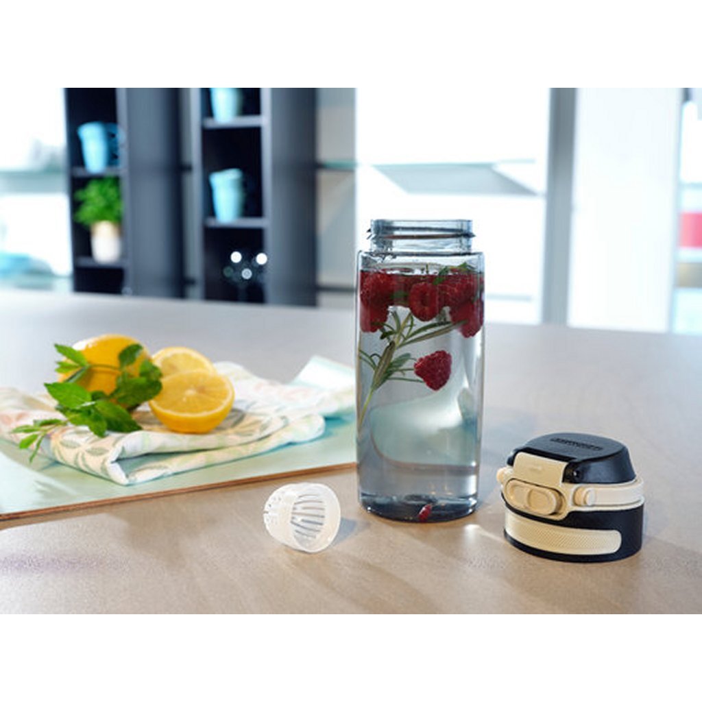Op weg naar universiteit, school of sport en met maar één hand kunnen drinken? Dat is geen probleem met deFlip tritan drinkfles die met slechts één hand te bedienen is.Omdat hij is voorzien van een praktische drukknop die met de wijsvinger te bedienen is.Er zit ook een slot op het deksel zodat de fles in de tas niet per ongeluk open gaat.Verder zorgt de schroefdop ervoor dat deze 100% lekvrij is.Met behulp van de draagbeugel kan de drinkfles eenvoudig aan een rugzak of tas worden bevestigd.Er zit een softgrip oppervlak op het deksel zodat deze comfortabel in de hand ligt en makkelijk te openen is. Hoogwaardige tritan plastic, dan weet je zeker dat hij helemaal vrij is van vervuilende stoffen.Daarom is de drinkfles ideaal voor kinderen of voor sport.Het is natuurlijk hittebestendig.Daarom kunnen koude en warme dranken in de fles worden gevuld tot een temperatuur van 80 °C.Dankzij het schroefbare filter in het deksel van de drinkfles kunnen kruiden of fruit de inhoud verfijnen zonder het drinken te beïnvloeden.