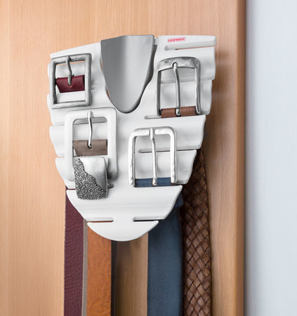 Leifheit 45410 Ceintuurhanger OmegaMet de Leifheit riemenhouder Omega 12 riemen stabiel en plaatsbesparend opbergen. Riemen en ceinturen zijn overzichtelijk hangend opgeborgen, onder handbereik. Het materiaal van de riemenhouder is van zeer hoge kwaliteit. Eenvoudig te bevestigen door plakken of schroeven (inclusief bevestigingsmateriaal).