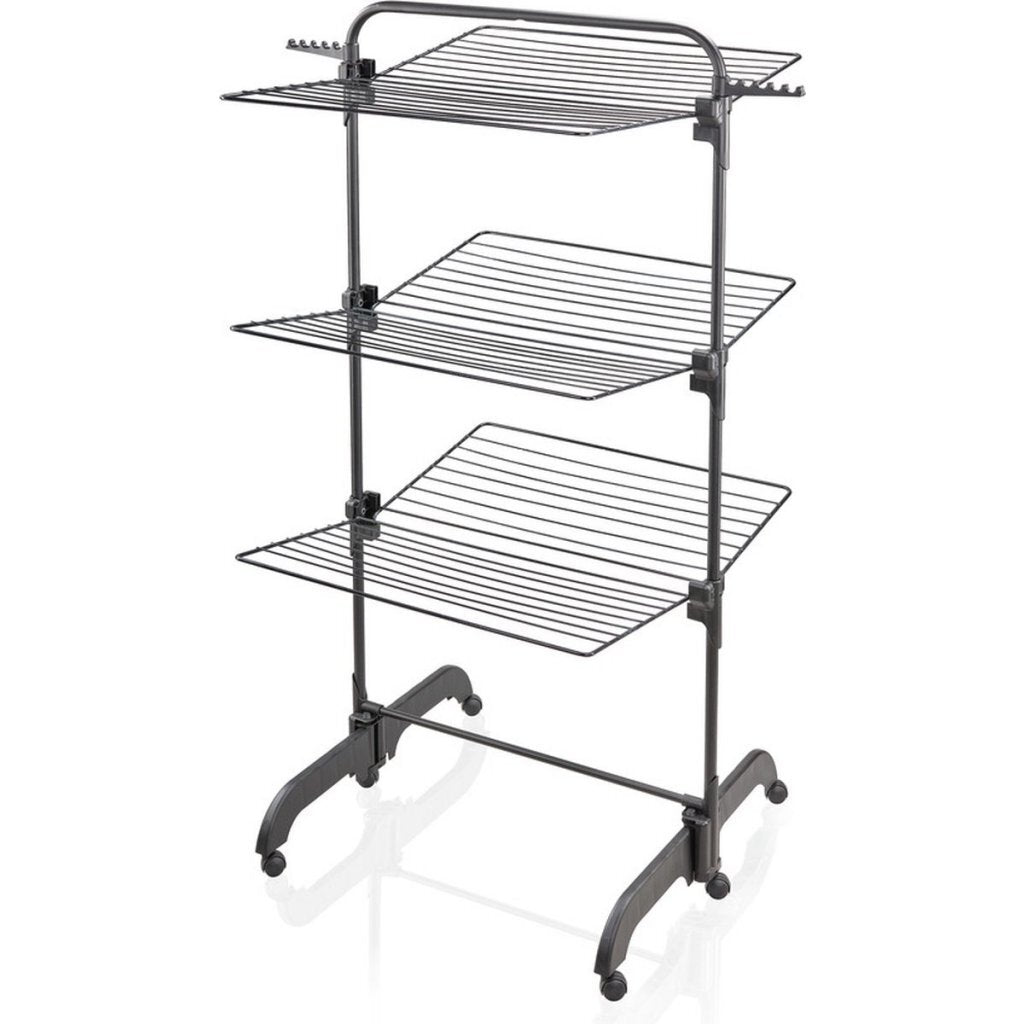 Het ruimtewonder van Leifheit in modern en aantrekkelijk zwart! Met zijn afmetingen van max. 76,5 x 70 cm past de droogtoren in een smalle badkamer, op een klein balkon of in een smalle gang. Drie boven elkaar liggende droogniveaus bieden een drooglengte van 42 meter en ruimte voor maximaal 4 wasmachineladingen. Omdat de droogroosters afzonderlijk kunnen worden ingeklapt, kan de torendroger halfzijdig worden gebruikt en makkelijk tegen een muur worden geplaatst. Dankzij de 6 geïntegreerde, soepel lopende wielen kan hij bij volle belading in alle richtingen worden verplaatst. De wielen hebben een 360° draaikoppeling die rondom bewogen kan worden. Dedroogtoren is ideaal voor gezinnen met beperkte droogruimte. Na gebruik kan je de 420 makkelijk inklappen: plat opgevouwen past hij moeiteloos tussen de kast en de muur. Dankzij de 2 zijdelingse kledinghangerhouders biedt de droogtoren extra droogruimte. De hoogte is 1,45 meter.