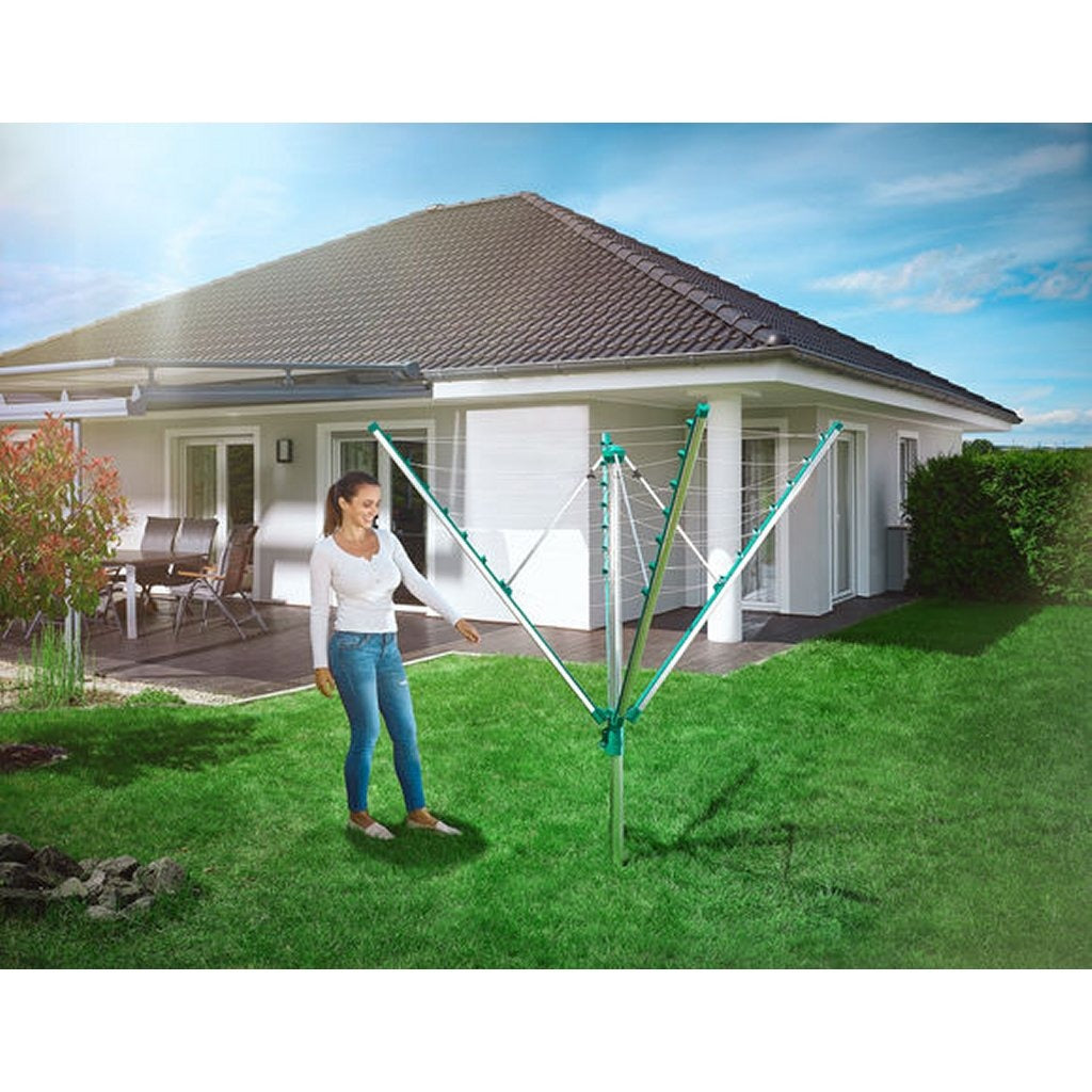 De Linomatic 500 Comfort heeft veel gebruiksgemak te bieden: de miljoenen keren bewezen Leifheit-waslijnautomaat, het lichtgewicht, open design en een aantal extra's voor nog meer comfort. Als de droogmolen dicht is, zijn de waslijnen netjes opgeborgen in de draagarmen. Zo zijn ze goed beschermd tegen vuil. Alle Linomatic-droogmolens hebben deze handige functie. Schone lijnen, schone was! De Linomatic 500 Comfort is gemakkelijk te openen met het Easy-Lift-systeem. Dat werkt met wel 40% minder krachtsinspanning in vergelijking met veel andere droogmolens. Gewoon aan het koord trekken ? en de waslijnen spannen zich. De afstanden tussen de steunpunten zijn klein, daardoor zijn de lijnen ook na jarenlang gebruik nog strak gespannen. Bijzonder praktisch: het trekkoord wordt automatisch weer de droogmolen in getrokken. Als je de droogmolen sluit, worden de waslijnen de draagarmen in getrokken, zodat ze droog en schoon blijven. En als je de droogmolen open doet, worden ze automatisch weer gespannen. Nog een voordeel: de was droogt zacht en op een natuurlijke manier in de buitenlucht, bovendien met nul energiekosten. De Linomatic 500 Comfort heeft 50 meter waslijn, zodat er vier wasmachineladingen tegelijk aan kunnen hangen. Het grootste stuk waslijn is 1,86 meter. De Linomatic 500 Comfort past dus ook in een klein tuintje of op het terras, maar is ook groot genoeg voor grote stukken wasgoed zoals dekbedden en badlakens. Aan elk van de 4 draagarmen kan bovendien een kledinghanger hangen ? dat biedt extra droogruimte en is ideaal voor het drogen van overhemden en blouses. Alle gebruikte materialen zijn weerbestendig en uv-bestendig. Inclusief grondanker voor vastzetten in beton.