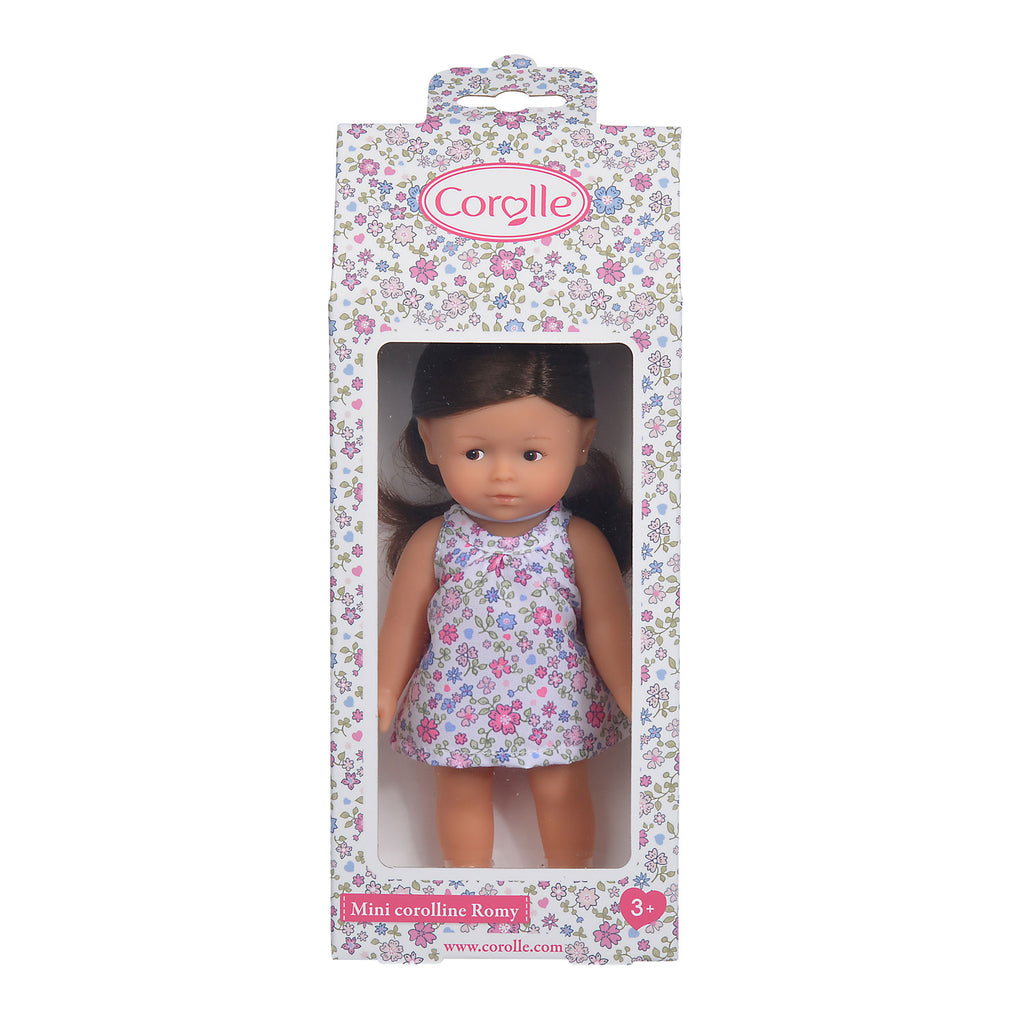 Dit kleine popje heet Romy en is 20 centimeter. Ze heeft bruine ogen en lange bruine haren. Romy heeft een jurkje met verschillende kleuren bloemetjes aan en ze draagt roze schoentjes. De pop is gemaakt van buigzaam vinyl en heeft een subtiele vanillegeur.