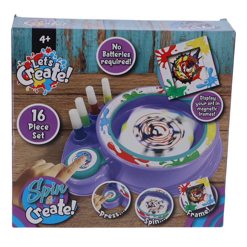 Knutselsetje voor het maken van draaikunst. Leg het lege vel op het draaiplateau en giet verf er verf overheen. Door het draaien krijgt de verf een prachtig effect. In de set zitten 4 tubes verf (blauw, groen, geel en bruin), blanco vellen en magnetische lijstjes voor het ophangen van de kunstwerken. Geschikt voor kinderen vanaf 4 jaar oud.