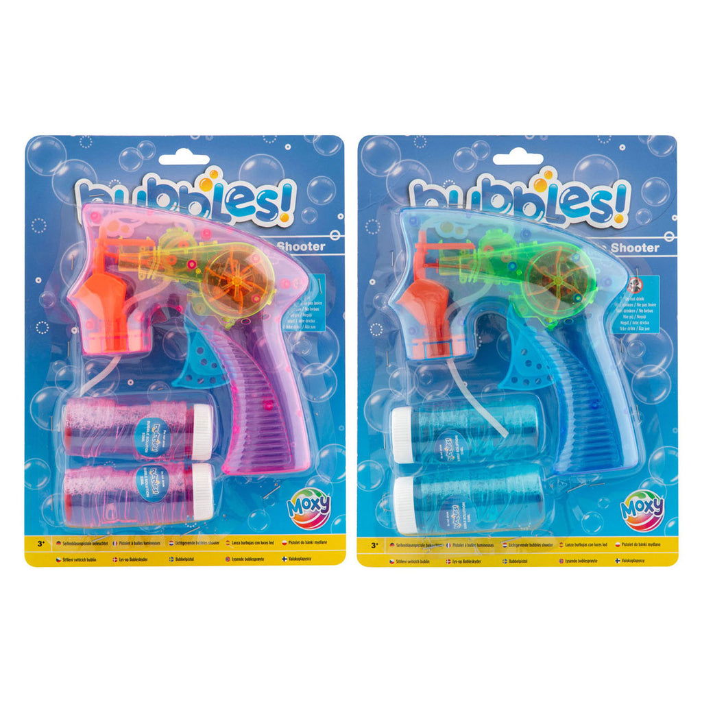 Bellenblaaspistool met lichteffect. Inclusief 2 flesjes van 50 ml bellenblaas. Verkrijgbaar in blauw en roze en geschikt vanaf 3 jaar.