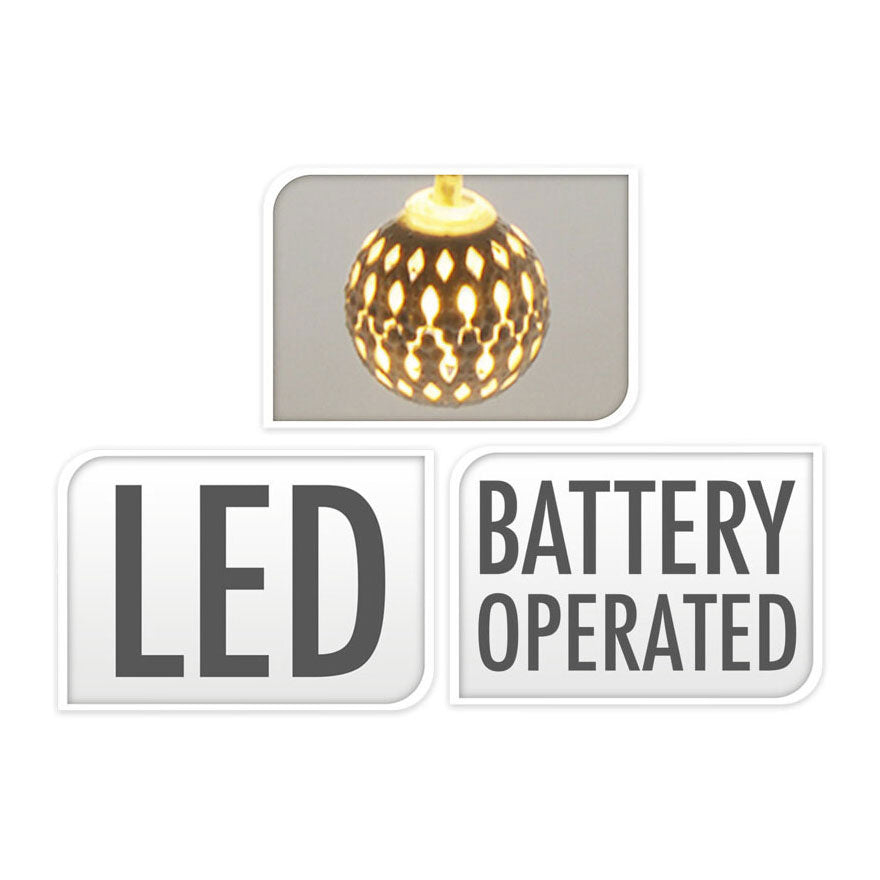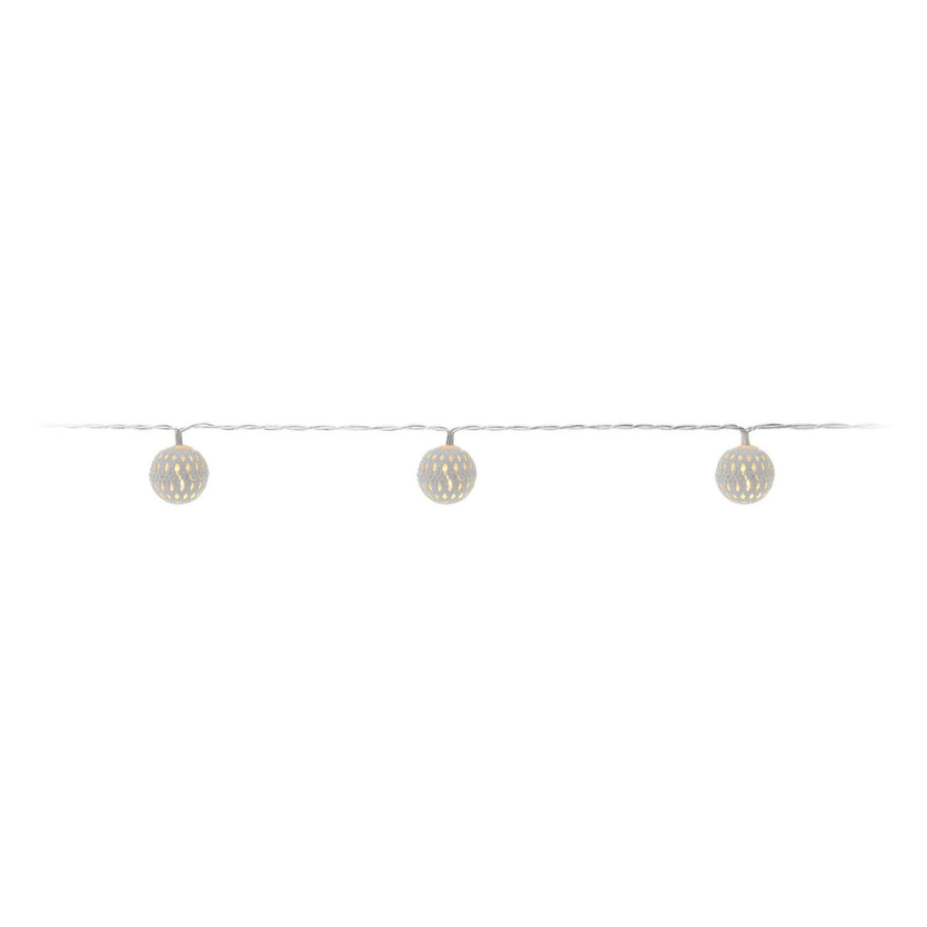 Lichtsnoer (transparant) met witte, metalen ballen en warmwitte lichtpunten. Het snoer is ca. 100 centimeter lang en heeft 10 ballen van elk ca. 2,5 centimeter groot. Werkt op 2 AA-batterijen, deze zijn niet inbegrepen. Geschikt voor binnenshuis.