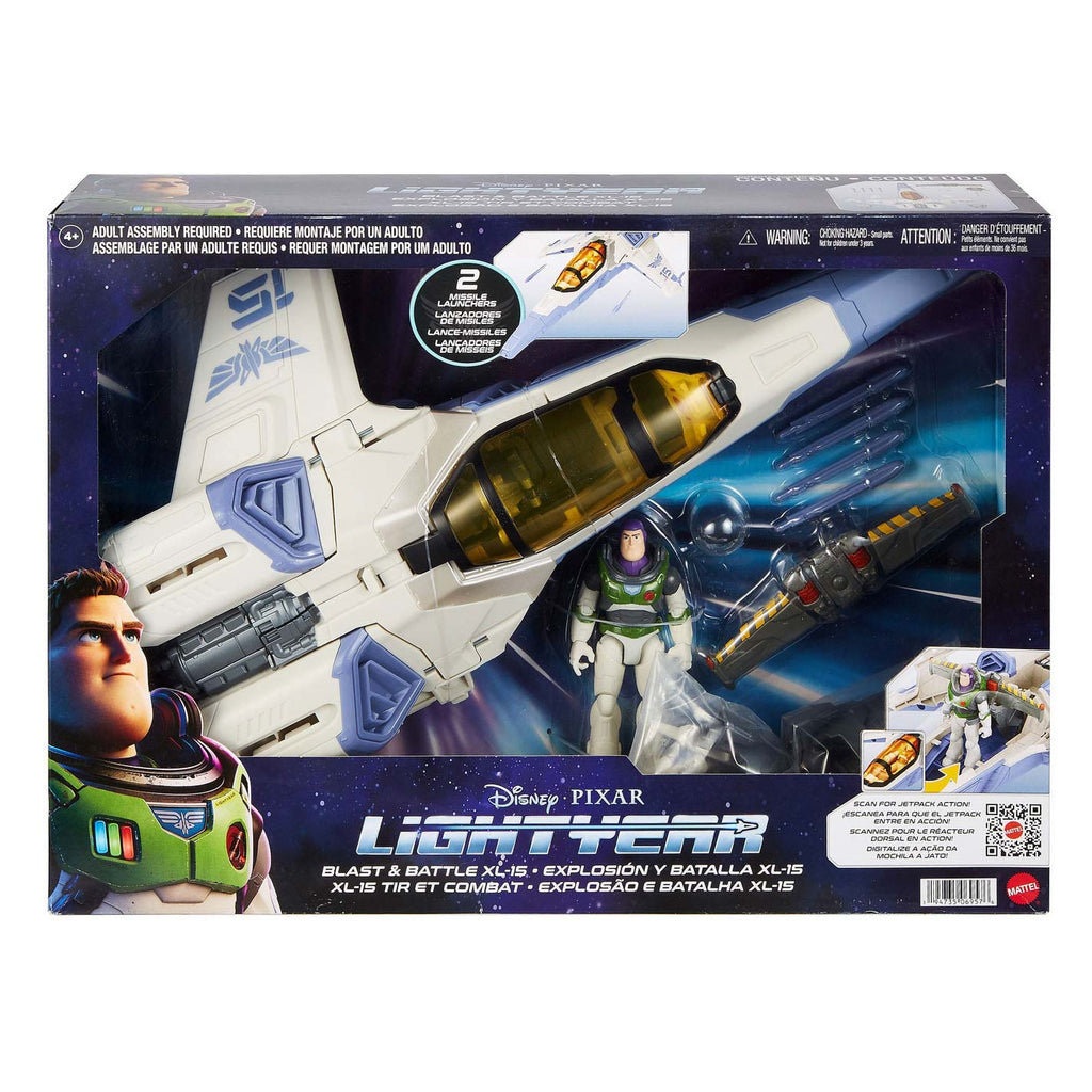 Ontdek Disney en Pixar's Lightyear. Buzz Lightyear en zijn bemanning zijn gestrand op een onbekende planeet! Om hun missie te voltooien en naar huis te keren, moeten ze de strijd aangaan met vijandige planten, gigantische insecten en de grote vijand Zurg. Fans gaan op een razendsnel avontuur met dit Blast en Battle XL-15 ruimteschip van 51 cm lang met Buzz Lightyear als piloot, om ook thuis de spanning en sensatie van Buzz Lightyear te kunnen beleven! Er past een jetpack met vleugels op de rug en schouders van het Buzz figuur van ca. 12,5 cm, dat vervolgens in zijn geheel in de cockpit past. Gebruik de hendel onder het voertuig om een beroemd filmmoment te activeren voor de heldhaftige Space Ranger! De vleugels passen ook op andere Buzz figuren uit Lightyear van dezelfde grootte (apart verkrijgbaar en niet overal leverbaar). Beleef de spannendste filmavonturen opnieuw met dit ruimteschip vol indrukwekkende extra's voor de mooiste verhalen. Met één druk op de knop vuurt het ruimteschip aan beide kanten projectielen af. Het heeft 4 projectielen, een openklappende cockpit en een landingsgestel dat echt uitklapt. Hoeft maar één keer in elkaar te worden gezet. Kleuren en versieringen kunnen afwijken.