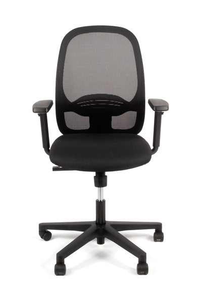 Bureaustoel Grace 01 zorgt voor een comfortabele zithouding door de brede rugleuning met verstelbare lendesteun. De armleuningen zijn 1D verstelbaar (hoog/laag) en door het synchroon mechanisme is de stoel kantelbaar en met een draaiknop is de weerstand te regelen. Ook de rugleuning is verstelbaar waardoor deze bureaustoel geschikt is voor maximaal 8 uur zitcomfort. De stoel is vervaardigd van metaal en heeft een kunststof afwerking. Het onderstel is gemaakt van kunststof en voorzien van 5 wielen die geschikt zijn voor zachte vloeren. Het polyester zitvlak (48 x 41 cm) is een synthetische vezel die licht, duurzaam, vormvast, kreukvrij en isolerend is en heeft een slijtvastheid van 85.000 zitcycli. De rugleuning is voorzien van netbespanning. Door de hendel onder de zitting is de luchtveer in hoogte individueel in te stellen van 43 tot 56 centimeter. De bureaustoel heeft een maximaal draagvermogen van 110 kg en weegt 12,5 kg. Kleur stof zwart/zwart. De bureaustoel is voorzien van Arbo norm EN1335. Made in Italy.