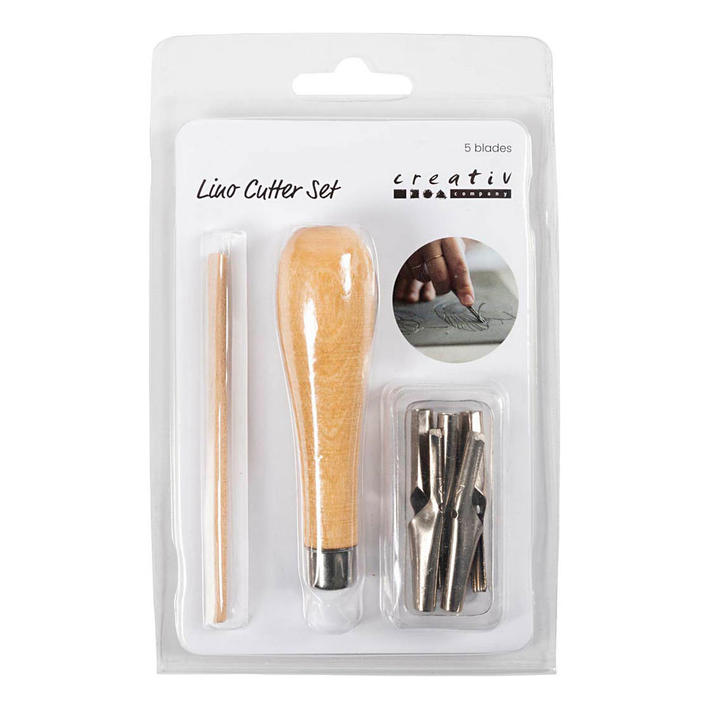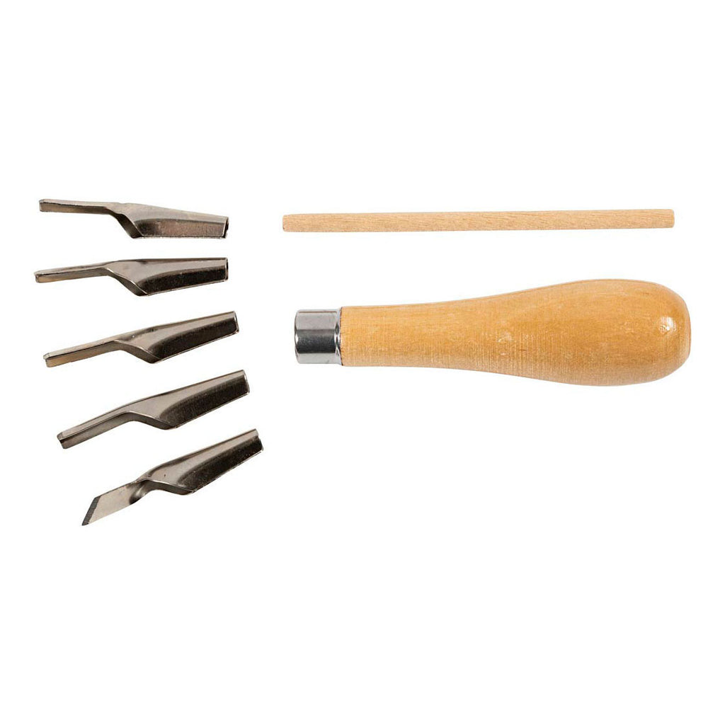 Linoleummessen met verschillende vormen en lengtes die in een houten handgreep worden gestoken. Meestal gebruikt om een ontwerp uit te snijden in een drukblok van linoleum of rubber.De messen zijn eenvoudig aan te brengen en uit te nemen uit de houten handgreep. Steek het uiteinde van het mes in de houten handgreep, vervolgens het houten stokje en druk daarna lichtjes om het mes vast te zetten. Neem het mes uit door het houten stokje opnieuw in te drukken en vervolgens naar buiten te trekken. Als u een houten handgreep voor meer dan één mes wilt, kunt u deze afzonderlijk kopen. Zorg er altijd voor dat u van zich af snijdt, want de messen kunnen bijzonder scherp zijn.