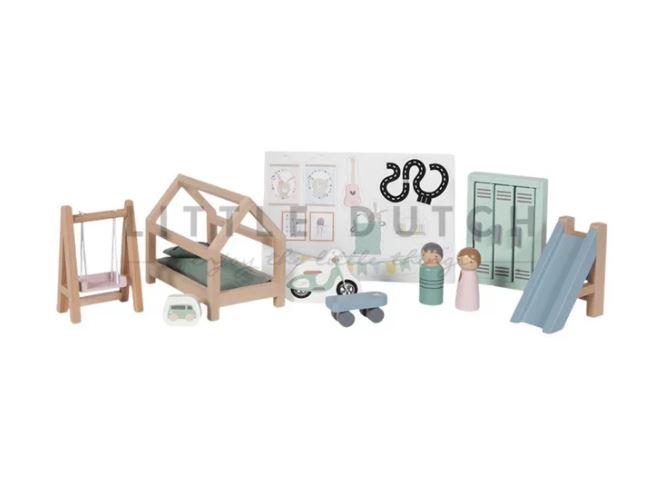 De Little Dutch Poppenhuis Uitbreidingsset kinderkamer kan gebruikt worden in het poppenhuis van Littlle Dutch. Het beschikt over verschillende items waarmee een kinderkamer ingericht kan worden.