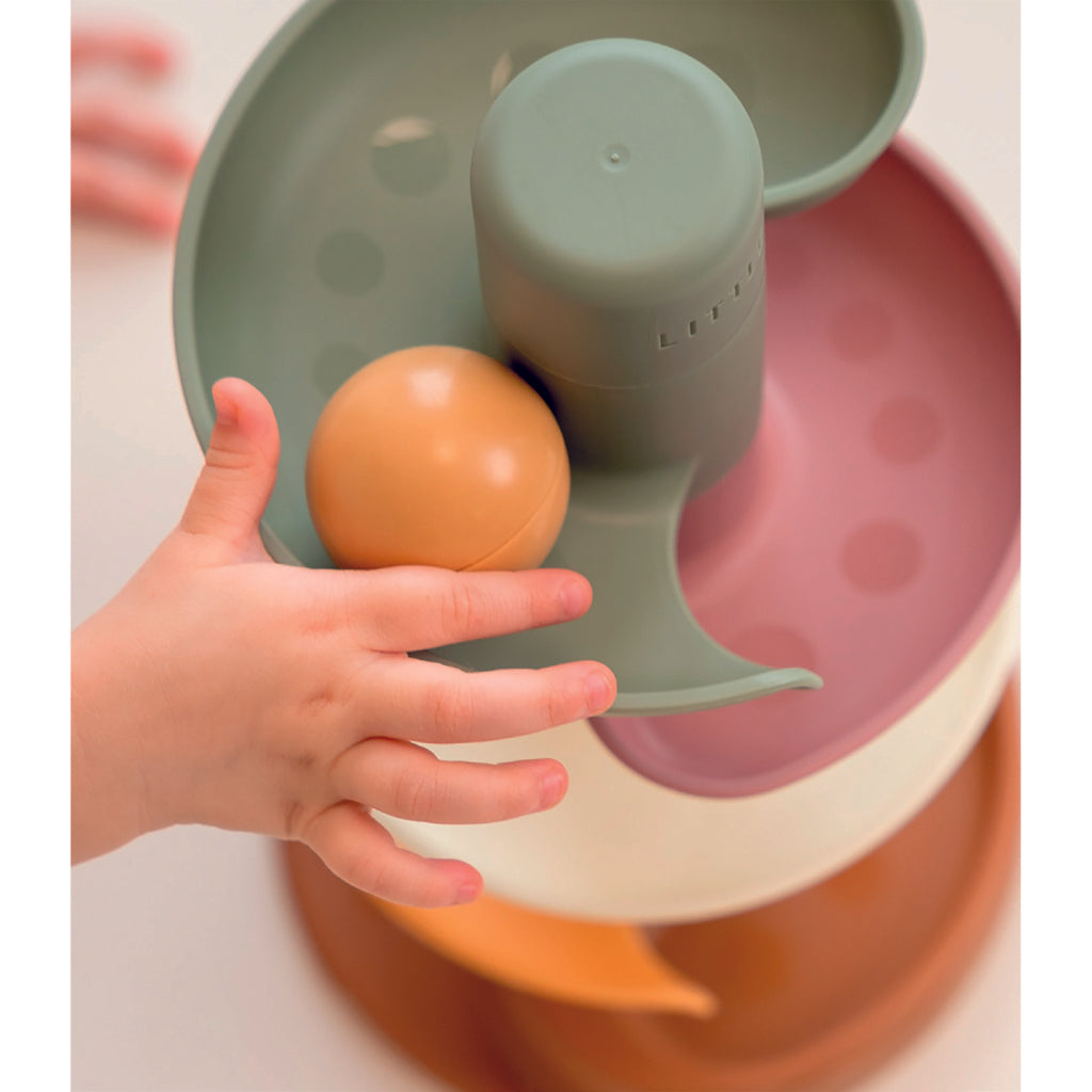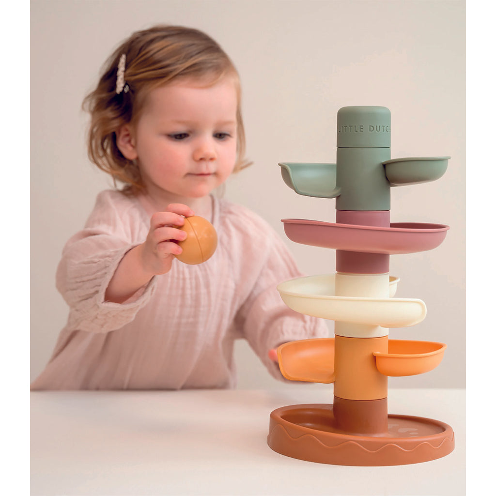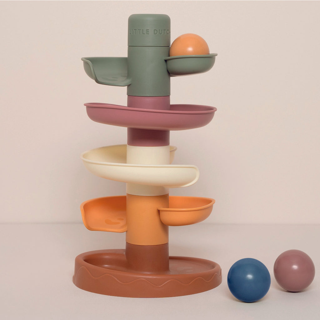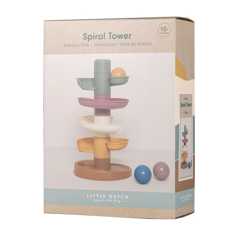 Laat de bal maar rollen! De vintage spiraaltoren van Little Dutch zorgt voor eindeloos veel speelplezier. Deze kleurrijke set bestaat uit 5 herkenbare gekleurde delen die jouw kleintje gemakkelijk op elkaar stapelt. Laat de ballen één voor één op de bovenste laag vallen en kijk hoe ze achter elkaar naar beneden rollen en slingeren. De spiraaltoren draagt bij aan de ontwikkeling van de hand-oog coördinatie en leert kleintjes over oorzaak en gevolg, waarmee het zowel leuk als leerzaam spelen is. Bij de spiraaltoren zitten standaard 3 lichte en gemakkelijk vast te pakken ballen in verschillende kleuren die bij beweging een geluidje maken. Dit speelgoed is uitgevoerd in de super trendy Little Dutch retro kleuren. De afmeting is: 18 x 18 x 30 cm. Geschikt voor kinderen vanaf 18 maanden.